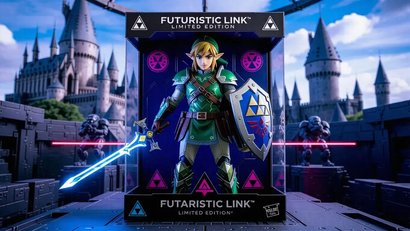 An anime-style collectible action figure of Link, reimagined as a futuristic soldier with armored exosuit, glowing plasma sword, and high-tech shield. Displayed inside a transparent premium toy box with sleek linings, Triforce stickers, and 'FuturisticLink Limited Edition' branding. Background: advanced Hyrule Castle with robotic sentinels, laser barriers, and high-tech skyline. Style: futuristic warfare.