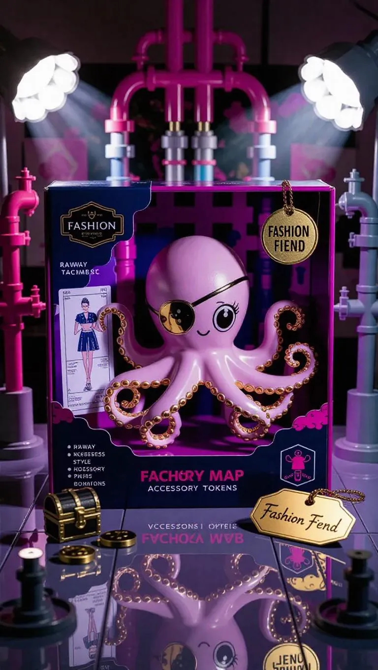 A stylish octopus toy with gold-plated tentacles, a treasure chest cannon, and a fashionable eye-patch. The box includes a runway map insert, accessory tokens, and a foil "Fashion Fiend" tag. Set against a factory background featuring a fashion-themed toy line with bubbly tubes and water pumps. Soft, glamorous light illuminates the scene, casting chic shadows and highlighting the metallic sheen of the gold-plated tentacles. Realistic style with a touch of whimsy.