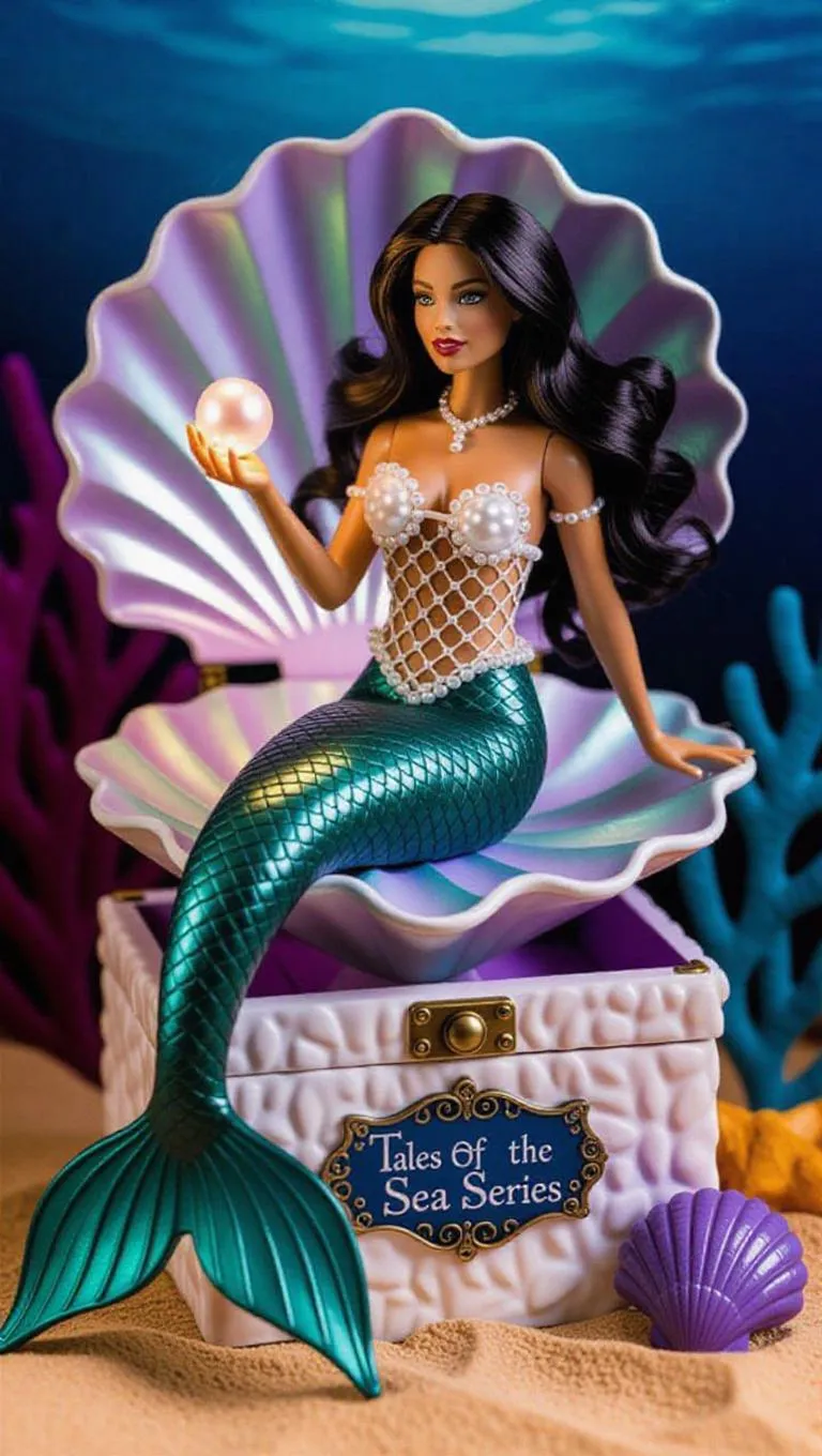 A highly detailed figure of a mermaid enchantress, her long, flowing onyx hair cascading over her shapely form. Seated on a large, iridescent seashell, her fishtail curls gracefully around her. Pearl-encrusted netting adorns her top, and her tail shimmers with scales in shades of pearlescent white and rich emerald. Holding a glowing pearl, emitting a soft, otherworldly light. The toy box resembles an underwater treasure chest, textured like coral and seashells, with "Tales of the Sea Series" emblazoned on the front. Mysterious shipwreck background, teeming with adventurous crabs and gleaming pearls. Gentle, filtered evening light creates a dreamy, ethereal glow, enhancing the magical and adventurous elements.