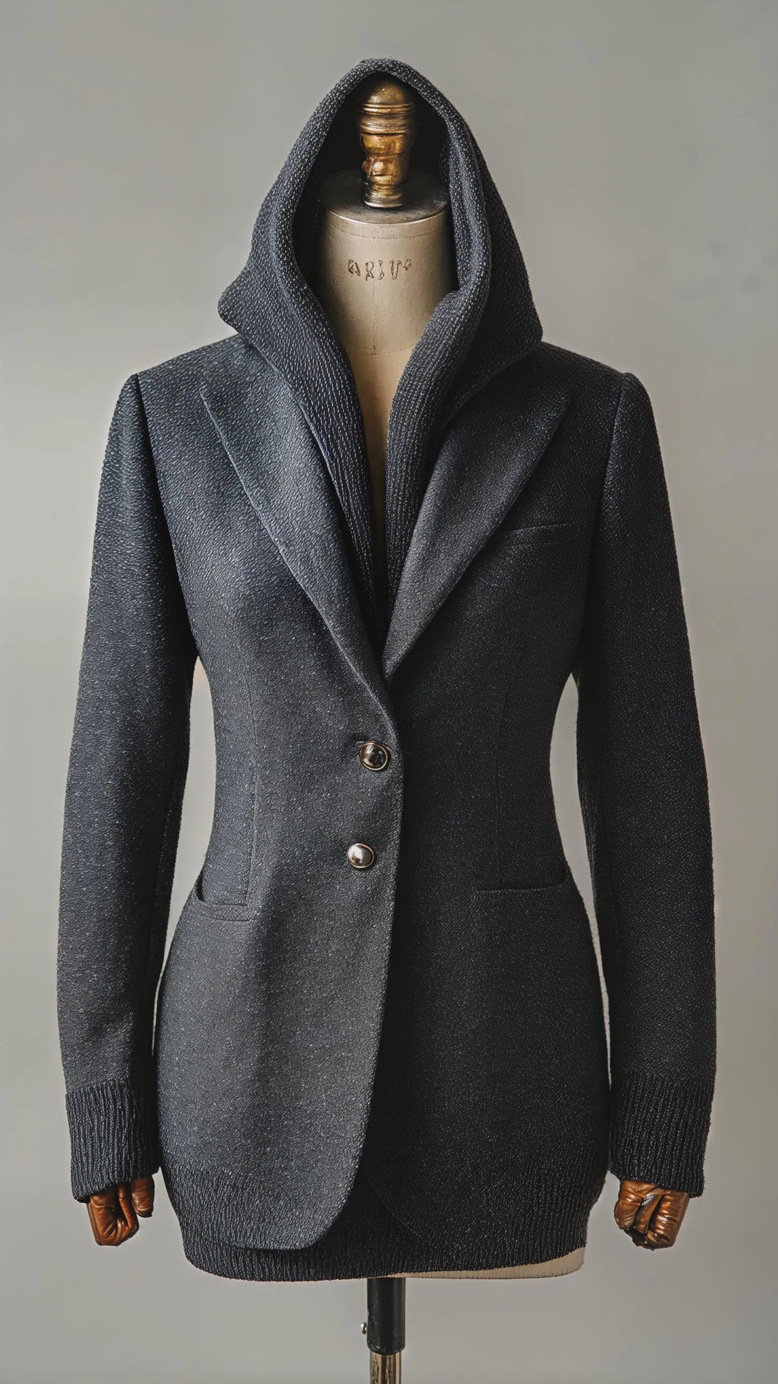 Could you make me a blazer that hybrids with a cashmere sweater in a dark grey color with a wide collar as well as hood on an anatomically correct mannequin