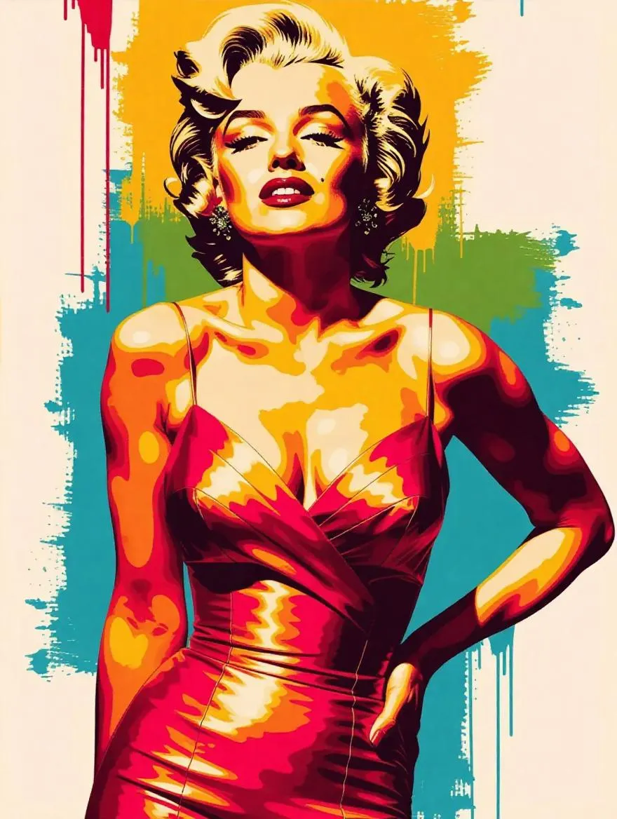 Transform text into stunning visuals with vivago.ai's AI art generator. Create a contemporary Marilyn Monroe painting featuring vibrant colors, fashionable attire, and retro glamour in a dynamic poster style. Perfect for modern art enthusiasts and pop culture-inspired designs.