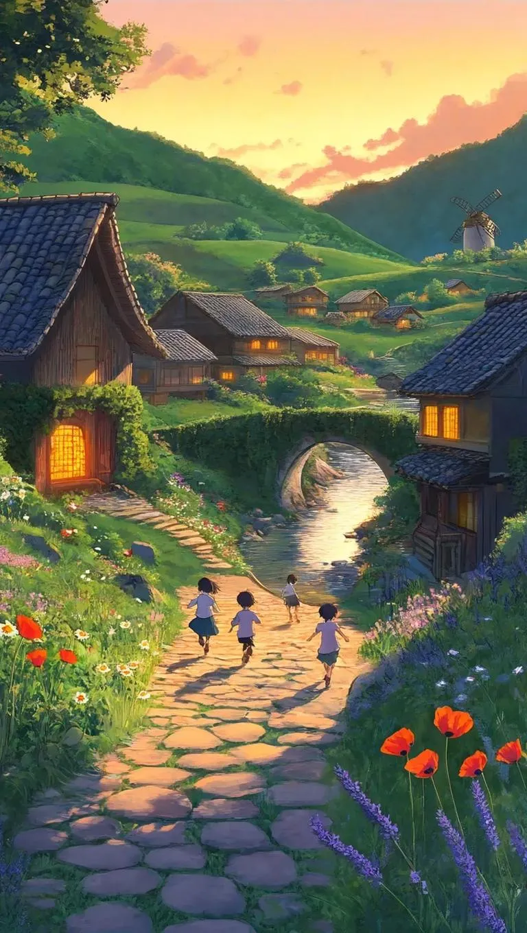 Immerse in a Studio Ghibli-inspired anime village at sunset, where glowing cottages, cobblestone paths, and a winding river blend watercolor textures with cinematic detail. Experience nostalgic charm through soft ink lines, wildflower blooms, and a pastel-hued windmill. Perfect for fantasy slice-of-life visuals, merging dreamlike warmth and painterly composition in a tranquil, storybook landscape. #AnimeArt #WatercolorFantasy #CinematicImagery