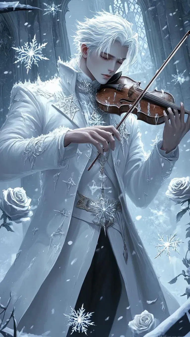 Pale aristocratic figure in frost-embroidered coat, shattered snowflakes, and glass violin emitting cold flames. Frozen roses, broken mirrors, and glowing sigil lips evoke regal mystique. Gothic castle backdrop with snow flurries. AI-generated fantasy anime art in silver-blue tones. Explore ethereal aesthetics with vivago.ai's AI effects and professional editing tools.