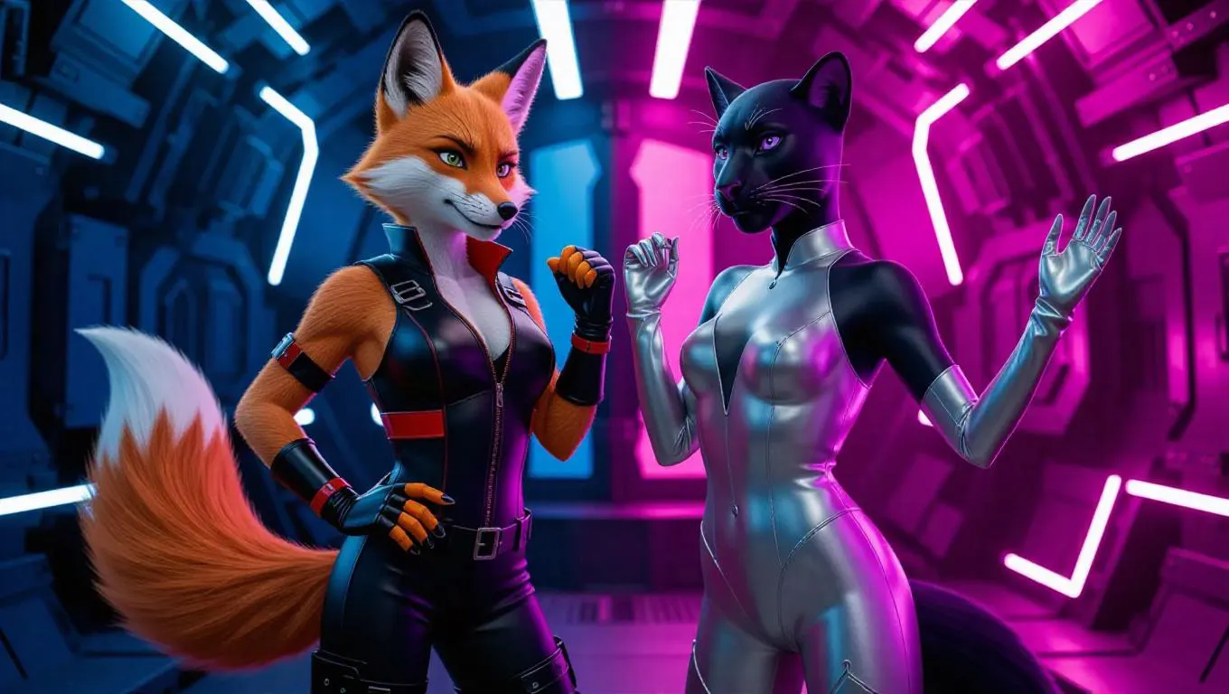 Explore AI-generated anthropomorphic characters Kira "Typhoon" Volt and Vivian "Shadow Frost" Night in vivid 4K Pixar-style animation. Features noir-inspired directional lighting, cinematic depth-of-field blur, ultra-detailed fur textures, and dramatic combat sequences. Powered by advanced AI effects for immersive sound-reactive particles, expressive micro-expressions, and studio-grade post-processing. Create dynamic duels with cinematic angles using Vivago.ai's professional AI art tools.