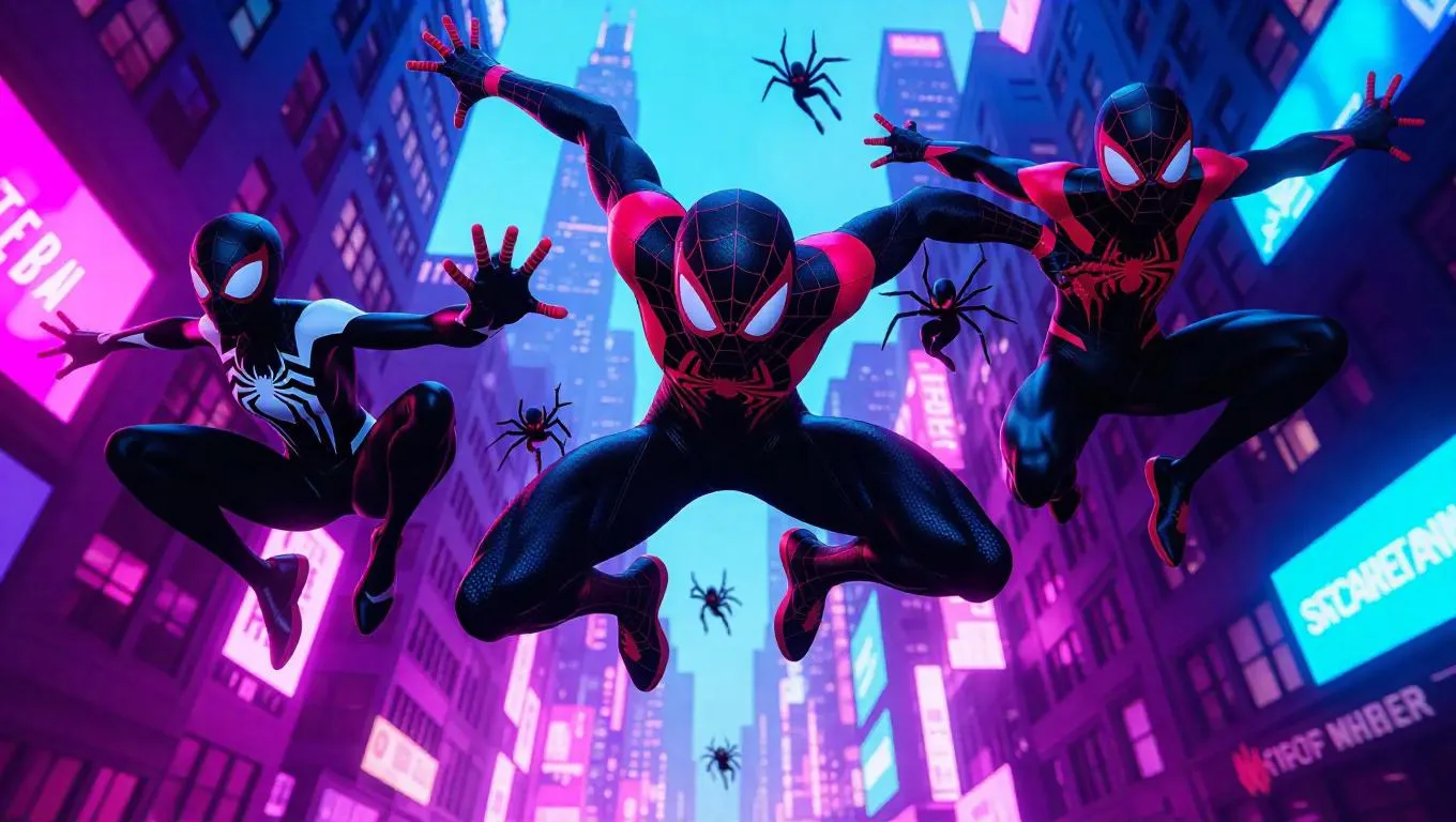 Create an action-packed scene featuring Miles Morales in his black Spider-Man suit, alongside Spider-Punk, Black and White Detective Spider-Man, the classic Spider-Man, and Spider-Gwen. The setting is a futuristic city with neon lights, towering skyscrapers, and flying vehicles. The composition should follow the rule of thirds, capturing each character in dynamic poses as they swing through the city. The lighting is vibrant and colorful, reflecting off the sleek, high-tech surfaces of the buildings. The overall art style is a blend of cyberpunk and comic book aesthetics, with a 16:9 aspect ratio to fully capture the expansive urban landscape.