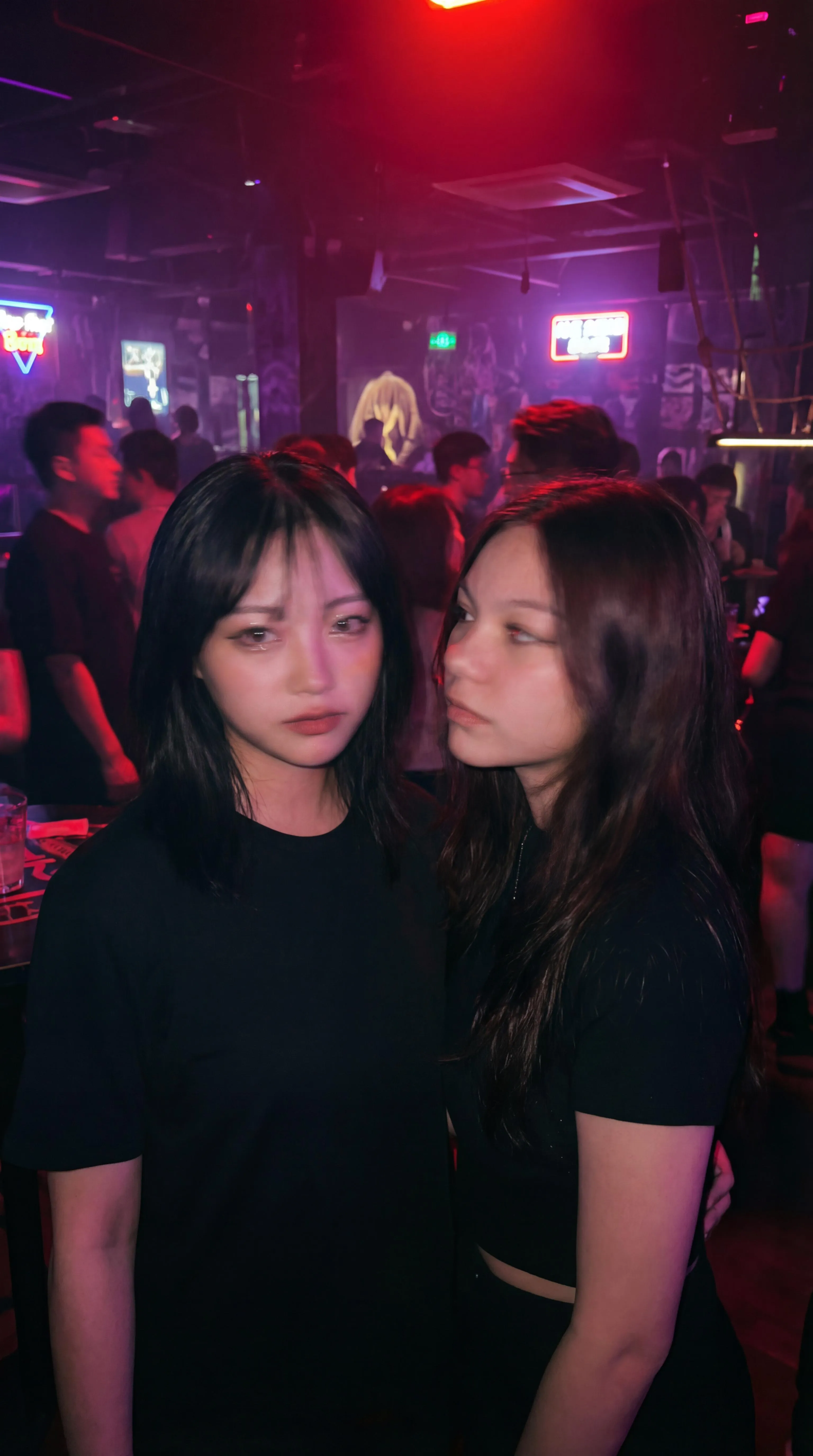 Capture mysterious intimacy with this AI-generated portrait. Two women stand close, faces artistically blurred against a dark background. Dramatic red and purple night hues set the mood. One gazes forward, the other looks aside. Create atmospheric, blurred portraits with Vivago.ai's powerful AI image generation tools. Ideal for evocative mood photography.