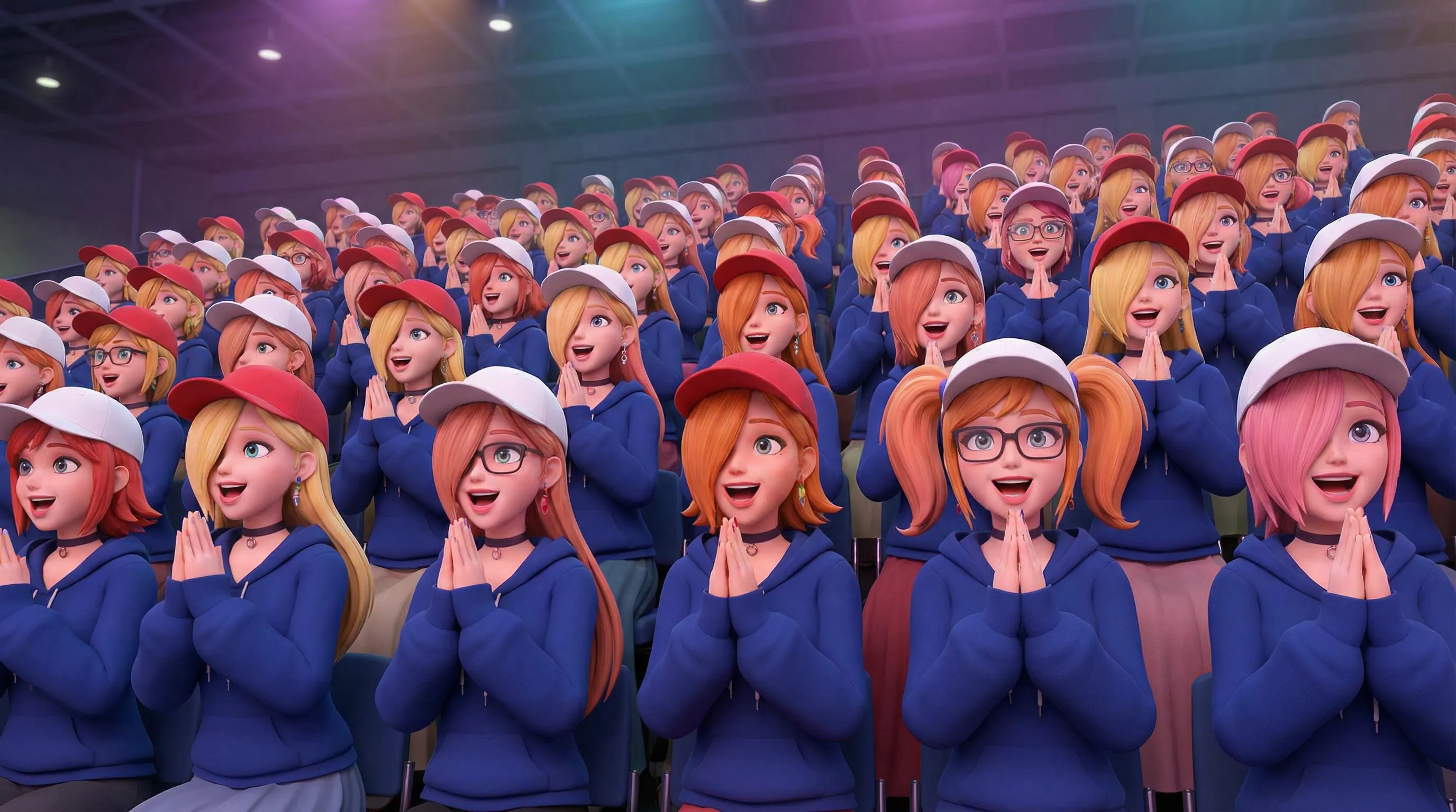 Generate lively CGI anime women inspired by Final Fantasy with vibrant multicolored hair & side-swept styles. Adorned in deep blue moe-sleeve hoodies hiding hands, red/white hats, chokers, skirts, & long nails. Capture their elated expressions, admiring prayer pose, & joyful screams in this vibrant digital art scene. Perfect AI anime character creation.