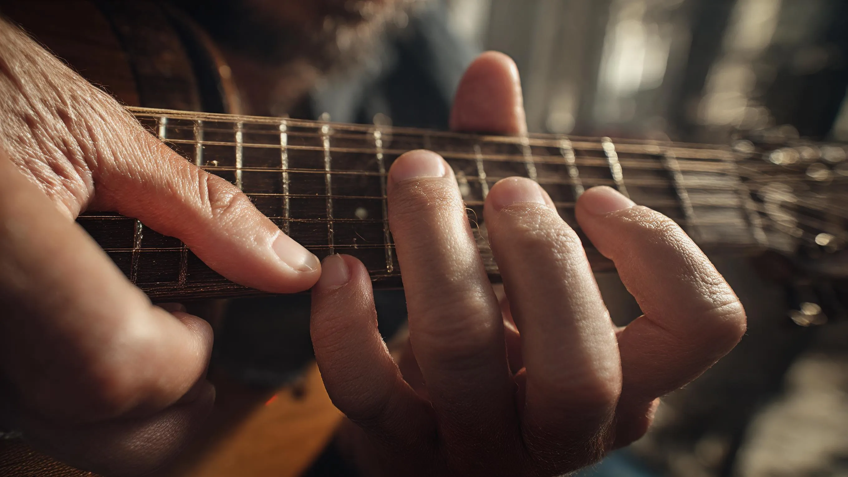 Generate a realistic, AI-powered close-up photo of a guitarist's hands playing an acoustic guitar strings. Focus on detailed finger placement and strumming action. High-quality, professional AI image generation for musicians. Create compelling visuals from text prompts.