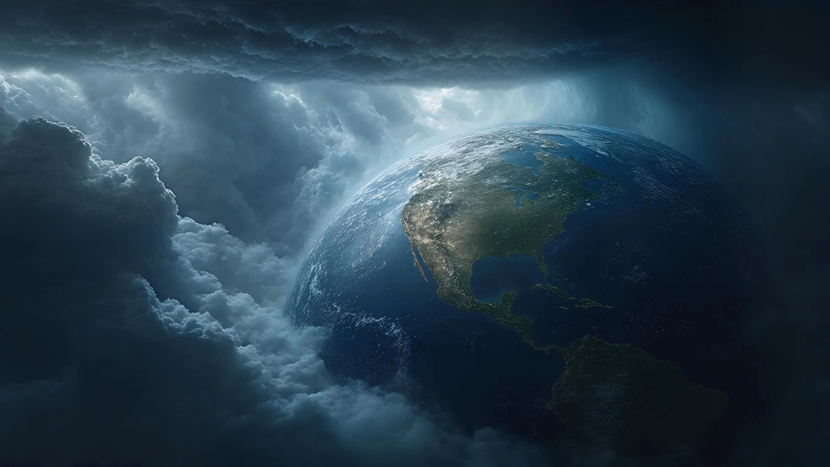 Visualize an apocalyptic planetary storm engulfing Earth with massive dark clouds. Experience AI-generated visuals of immense scale: helpless continents, dark cinematic atmosphere & imminent erasure. Create transformative, epic 16:9 visuals with VivaGo AI's image generator. Experience creation at cosmic scale. Explore AI-powered visual storytelling. (Word count: 49)