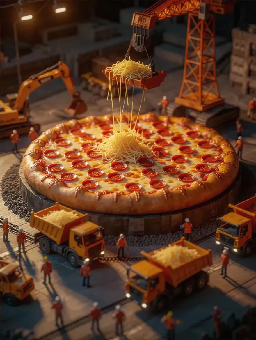 Create an ultra-detailed miniature diorama of a whimsical pizza construction site! Giant pizza base with tomato sauce, tiny helmeted workers direct dump trucks unloading cheese. Crane lifts piles of cheese, industrial tools, hyper-realistic textures, cinematic lighting. Use AI effects to transform text prompts into stunning visuals at vivago.ai. Word count: 55. Keywords: miniature diorama, pizza construction site, hyper realistic textures, cinematic lighting, AI effects, text prompts, vivago.ai.