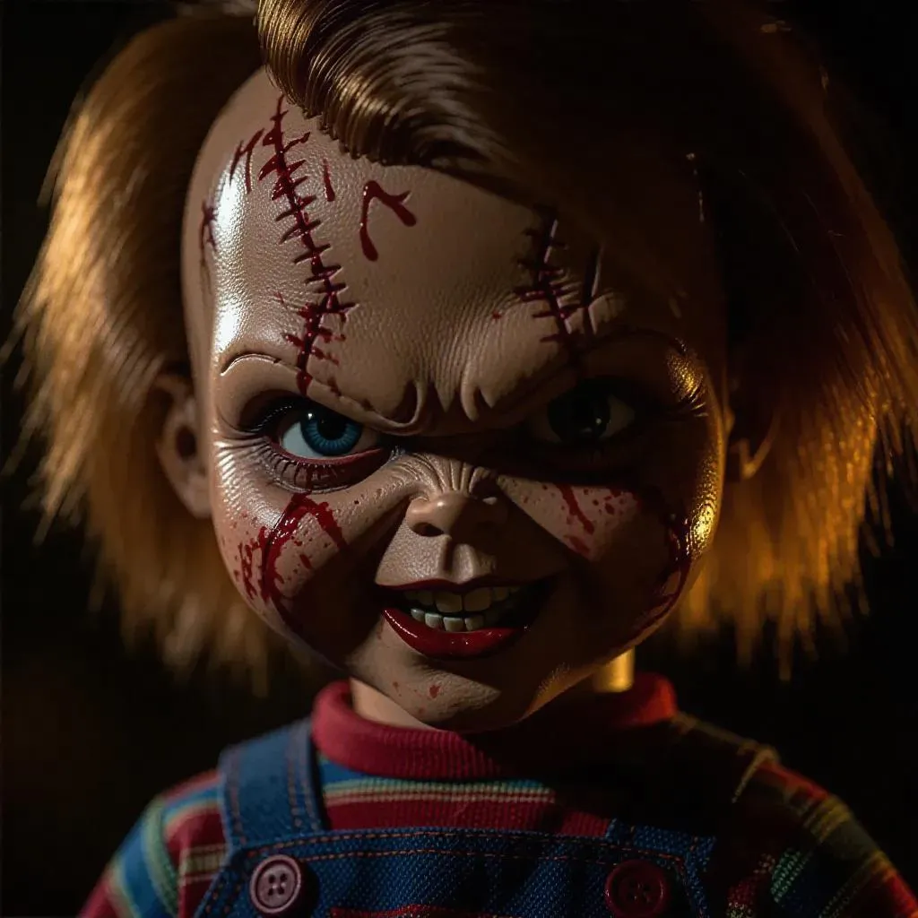 A terrifying close-up of Chucky, the infamous horror movie doll, with a sinister and creepy smile that sends chills down the spine. His face is covered in fresh blood, emphasizing his evil nature. The lighting is dim and eerie, casting deep shadows that enhance the horror atmosphere. The background is dark and ominous, possibly a dimly lit room or a sinister setting. The art style is hyper-realistic with detailed textures, capturing every gruesome detail of his stitched face, wild hair, and bloodstained overalls. The composition is unsettling, with Chucky's eyes glowing faintly to add an extra layer of menace.