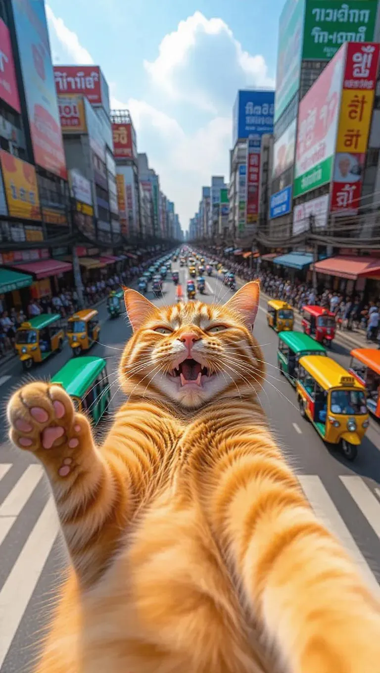 Create a surreal, photorealistic scene of a giant orange tabby cat lounging across Bangkok's bustling streets. Ultra-detailed fur, Thai signage, and tiny taxis navigate around its playful pose under clear skies. Perfect for AI image generation with vivid textures, humor, and realistic lighting. Explore vivago.ai's tools for whimsical, professional-grade visuals blending fantasy and reality.