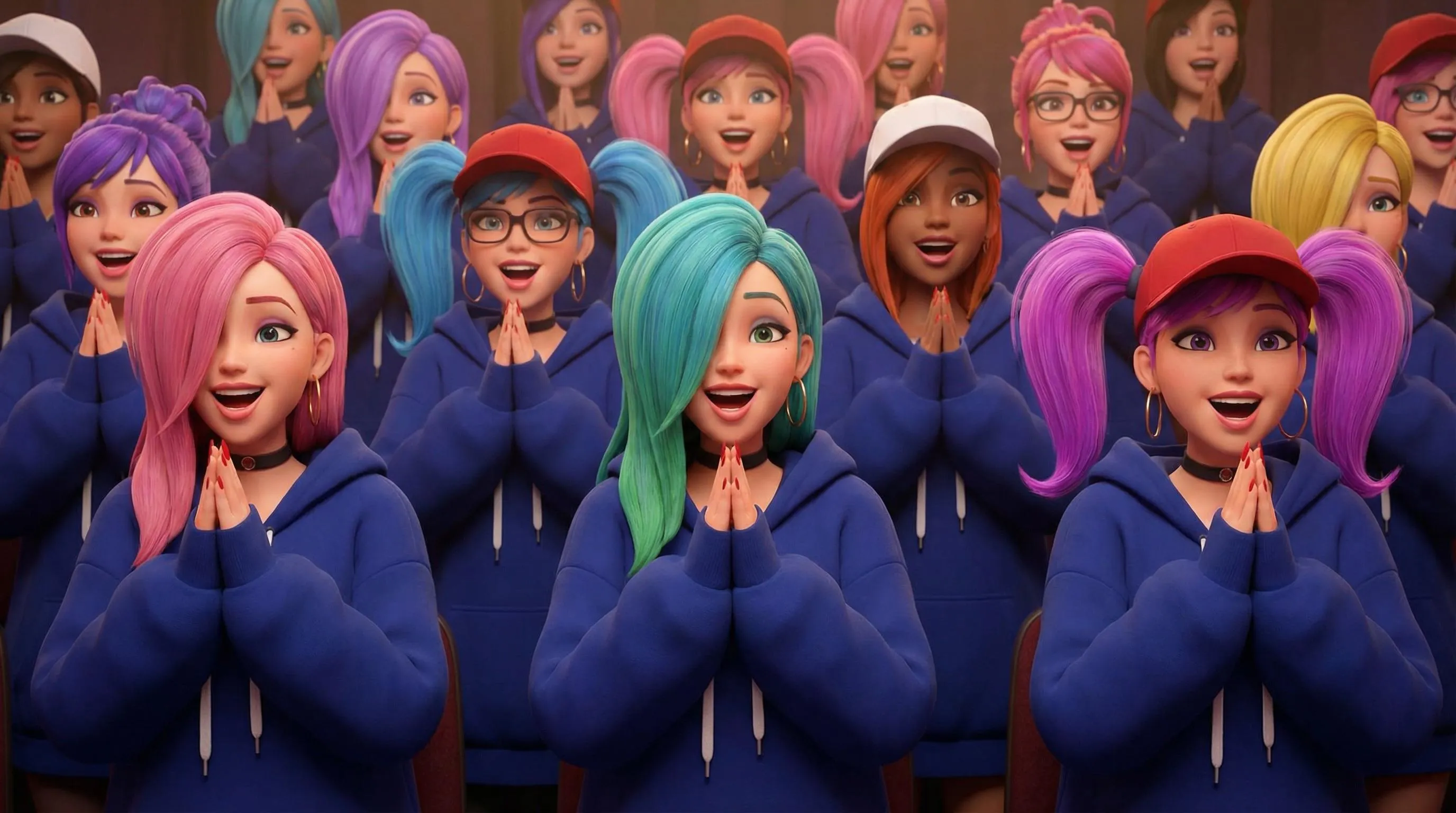 Generate lively CGI anime women inspired by Final Fantasy with vibrant multicolored hair & side-swept styles. Adorned in deep blue moe-sleeve hoodies hiding hands, red/white hats, chokers, skirts, & long nails. Capture their elated expressions, admiring prayer pose, & joyful screams in this vibrant digital art scene. Perfect AI anime character creation.