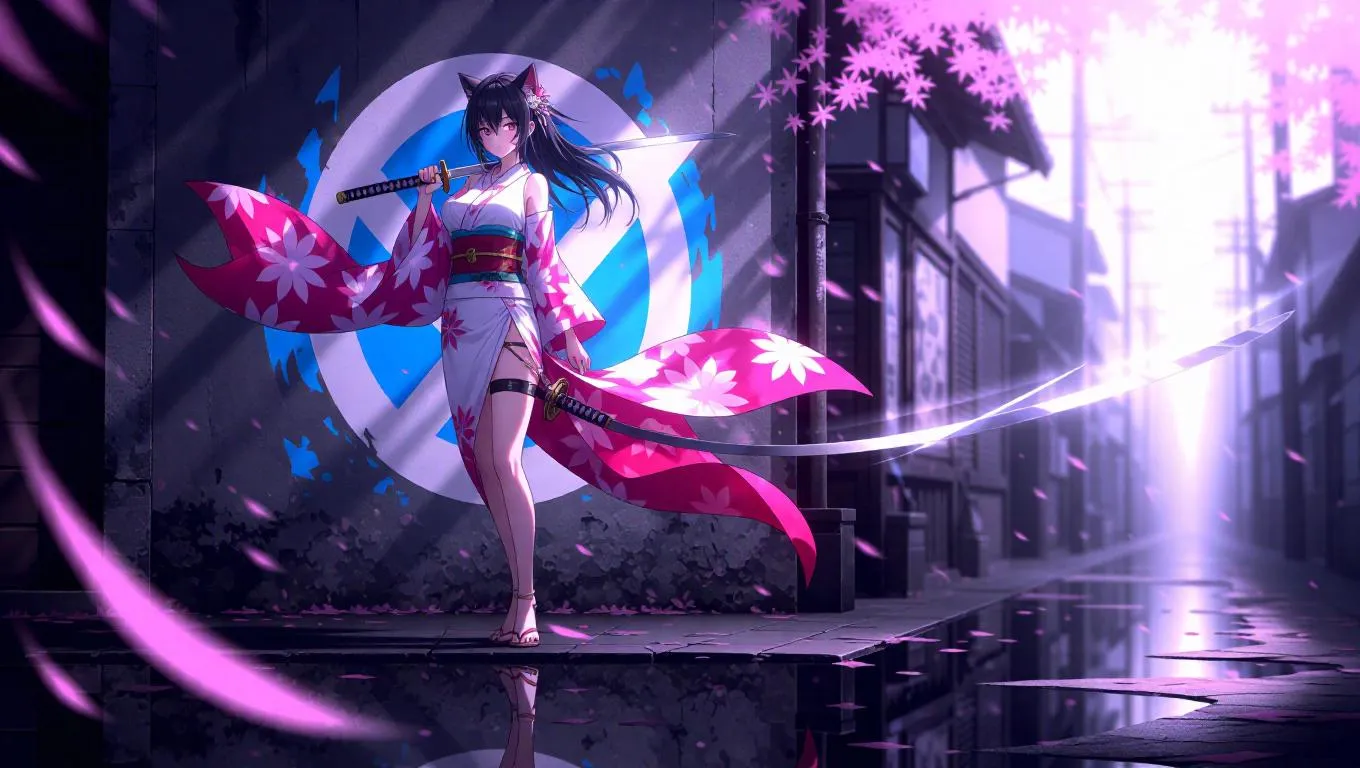 A mural on a weathered alley wall depicts: SmoothNoob_Quality, 1girl, solo, kimono, skimpy clothes, voluptuous body, katana, sword stance, unsheathing, detailed pupils, night, falling leaves, sword afterimage, glowing eyes, spark, geometric bodypaint, demonic energy, skindentation, powerful imagery, absurdres, best quality, extreme details, dynamic scene, very aesthetic, epic, volumetric lighting, real puddles mirror the scene, enhancing the illusion of movement, gentle and romantic anime style, soft greys and pale pinks, wet cement, dreamy, nostalgic atmosphere.
