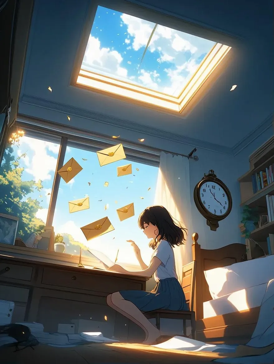 In a serene bedroom, a girl sits at her desk bathed in the soft glow of a skylight. Unopened letters, sealed with golden thread, float mid-air as she reads, the light refracting around her like rippling water, evoking memories of forgotten summers with bicycles, fireworks, and distant waves. The clock on the wall lacks hands, adding to the dreamlike ambiance. Strong interior lighting contrasts with the gentle skylight, creating a Makoto Shinkai-like atmosphere. The overhead quarter-turn camera angle captures the intimate, soft scene.