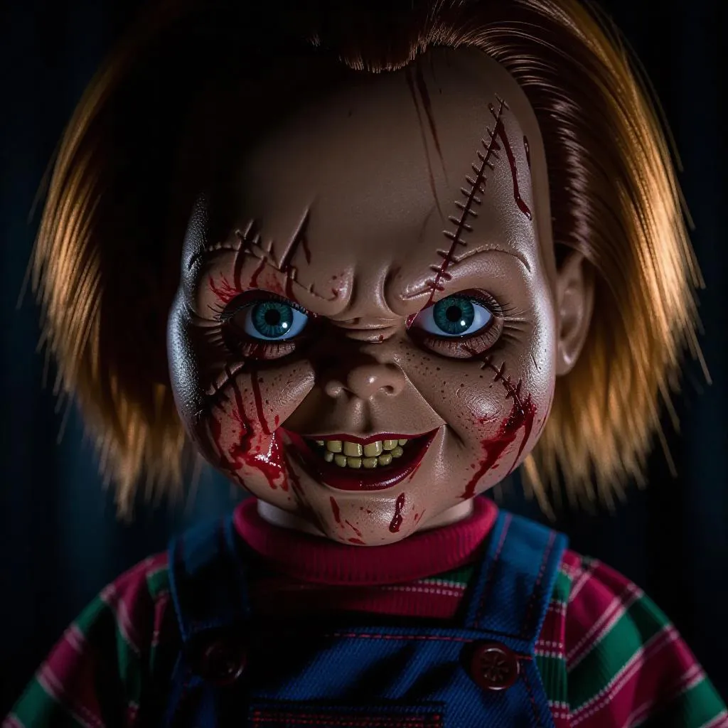 A terrifying close-up of Chucky, the infamous horror movie doll, with a sinister and creepy smile that sends chills down the spine. His face is covered in fresh blood, emphasizing his evil nature. The lighting is dim and eerie, casting deep shadows that enhance the horror atmosphere. The background is dark and ominous, possibly a dimly lit room or a sinister setting. The art style is hyper-realistic with detailed textures, capturing every gruesome detail of his stitched face, wild hair, and bloodstained overalls. The composition is unsettling, with Chucky's eyes glowing faintly to add an extra layer of menace.