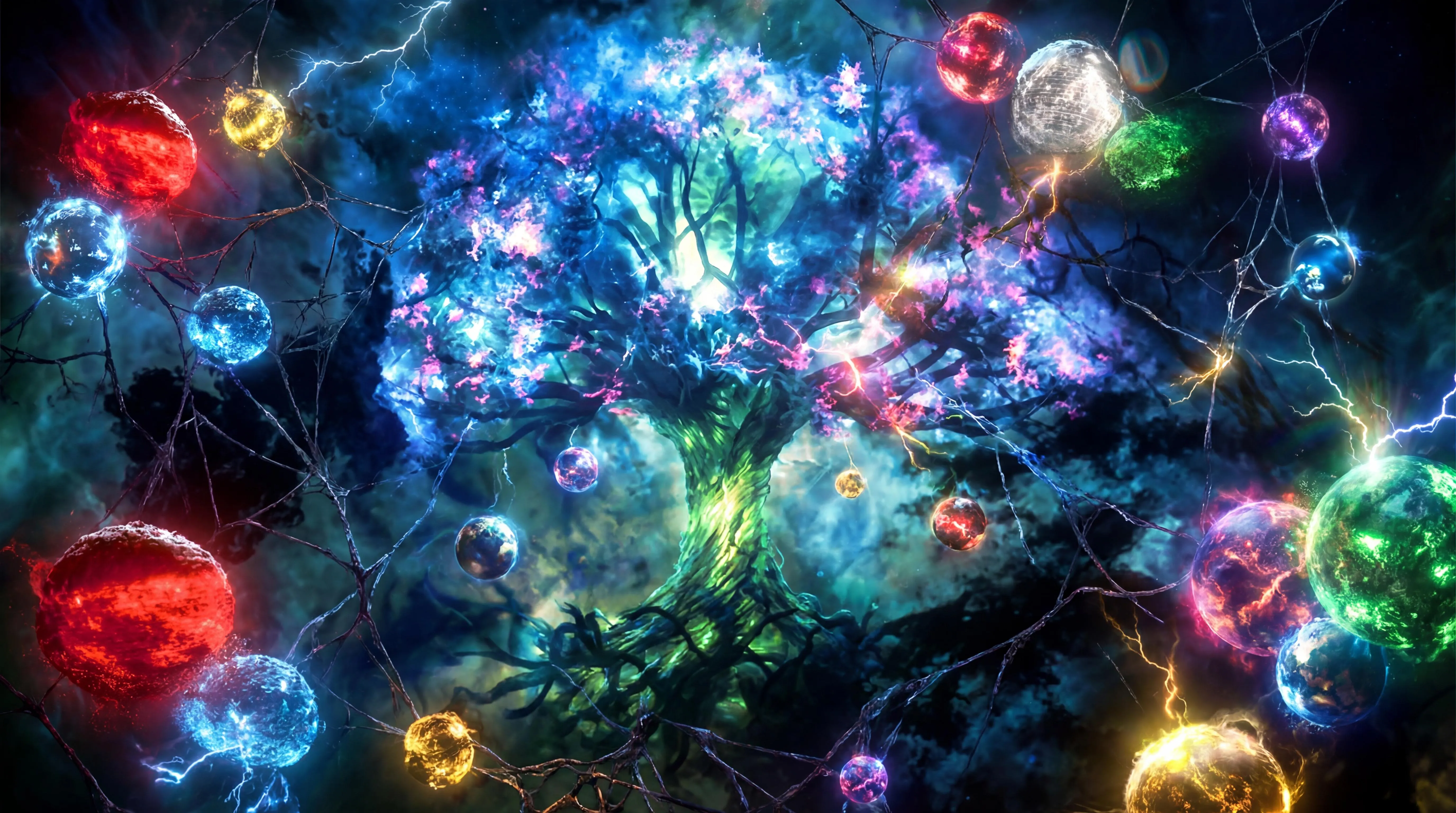 Explore AI-generated visuals merging Marvel, DC, Arrowverse, and Spider-Verse multiverses. See SSU's webs entwine with MCU's branches, Arrowverse's spheres fuse with DCEU's orbs. Create stunning multicolored, web-tree branched dimensional concepts. Generate this iconic cosmic convergence using AI art tools. No people. (47 words)