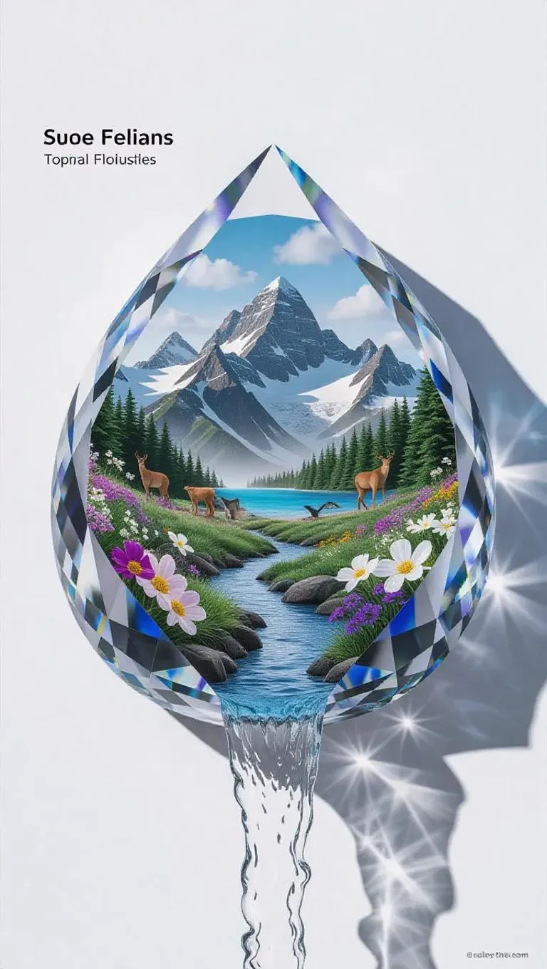 Explore AI-generated surreal art with this hyper-realistic crystal flower encapsulating a vibrant tropical forest, spring blooms, and wildlife. Fauvism and psychedelic rock elements blend in vivid hues, contrasting the stark white backdrop. Dynamic water flows from the crystal, creating a mystical stream. Perfect for surreal landscape enthusiasts seeking bold, imaginative visuals powered by cutting-edge AI creativity.