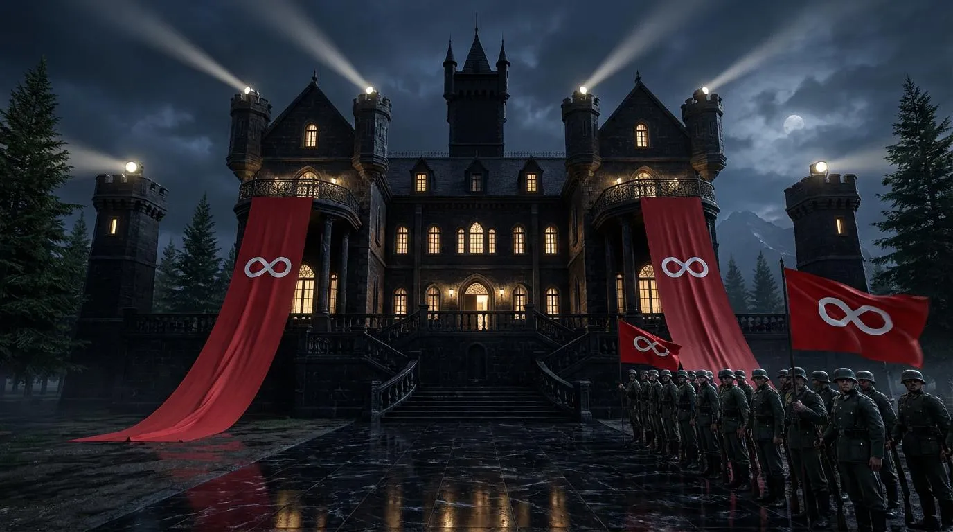 Create stunning AI-generated night scenes of a Gothic infinity mansion with dramatic red canvases, towering black spires, and searchlights. Generate images featuring a company of 1940s German soldiers on wet marble walkways amidst fluttering infinity flags. Design your own haunting, atmospheric visuals with Vivago.ai's powerful image generation tools.