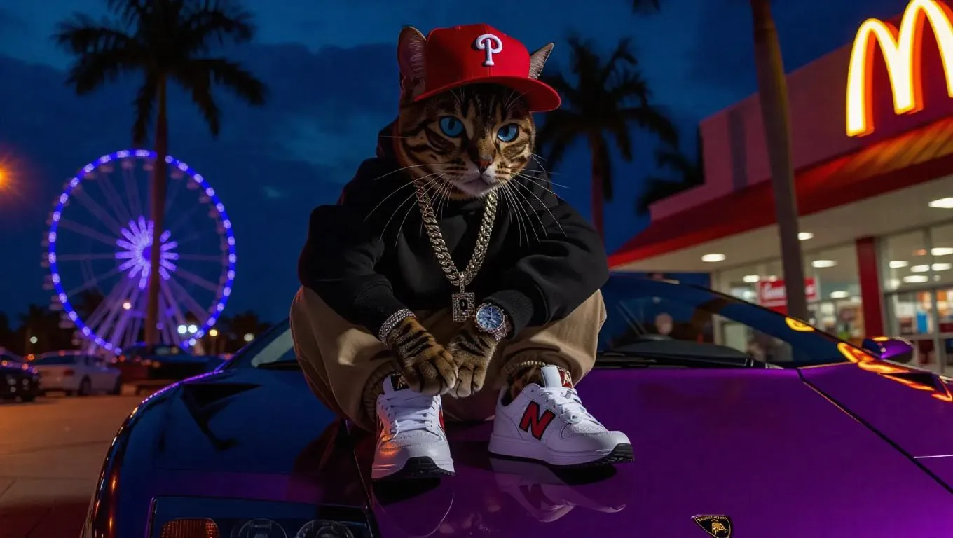 Anthropomorphic Bengal cat with blue eyes wears Phillies cap, diamond bling, and streetwear while sitting on a purple Lamborghini Diablo in Miami. Night scene features McDonald's, ferris wheel, palm trees, and dramatic shadows. AI-generated luxury feline in urban setting with gold wheels and vivid details.