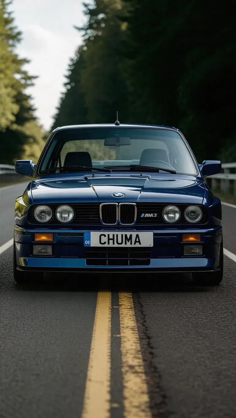 Generate dynamic AI visuals of a 1990s BMW M3 with custom "CHUMA" license plate, coming towards the viewer. Create realistic, retro car imagery using vivago.ai's AI tools for stunning AI-generated automotive designs and professional-grade creative projects.