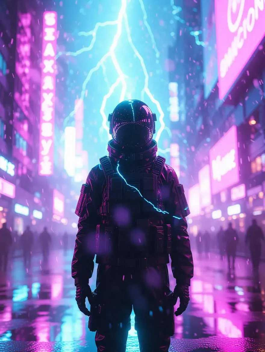 A glowing dimensional crack tears through the neon-lit sky of a futuristic cityscape, jagged edges pulsing with chaotic energy. Translucent particles of unknown matter float from the rift, dissolving into shimmering mist on rain-slick streets. Electromagnetic distortion warps holographic ads into surreal shapes. A lone figure in a reflective biosuit stands frozen, shadow split by fractured spacetime. Wide-angle lens emphasizes cosmic scale, dramatic chiaroscuro lighting contrasts deep indigo shadows with vibrant violet-cyan plasma. Floating debris orbits the anomaly in slow-motion gravitational eddies.