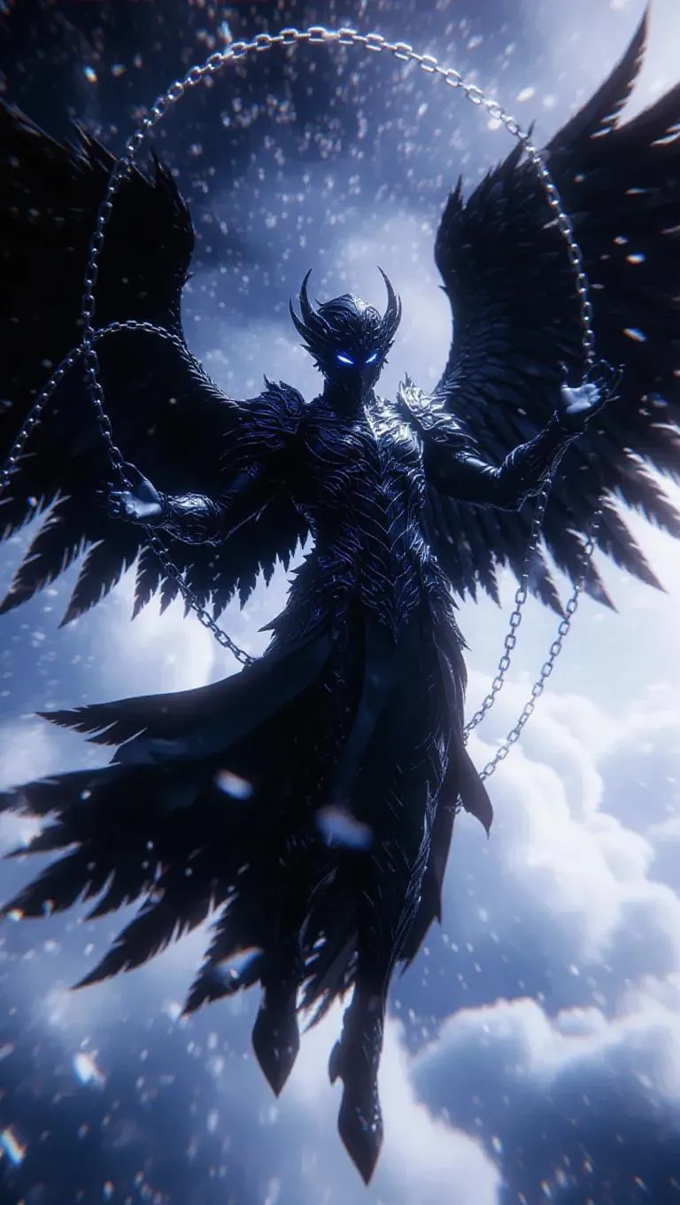 Witness Asmodeus' divine fall in hyper-realistic 4K: celestial chains clash with twilight robes as radiant feathers disintegrate mid-flight. AI-powered visuals capture exiled anguish through detailed armor, flaring black wings, and heaven's tempest. Perfect for mythic storytelling and high-resolution demonic/digital art creation.