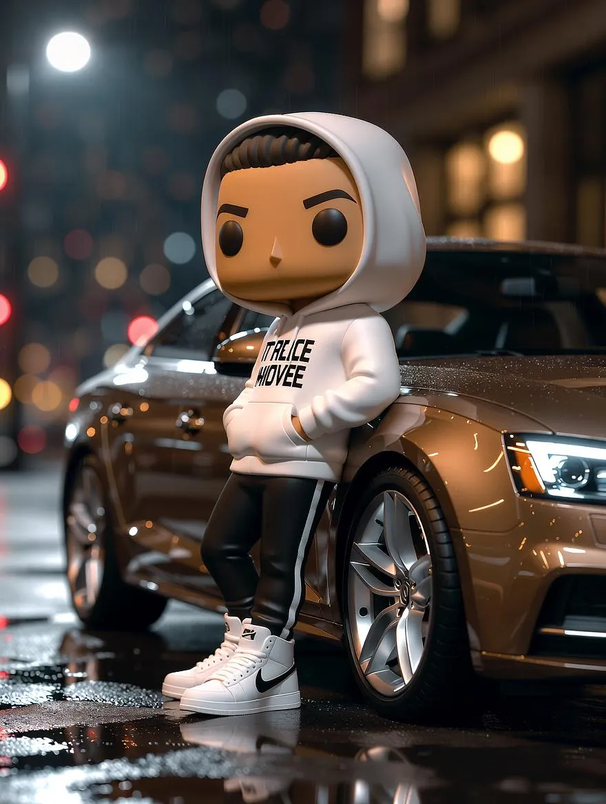 Create a custom 3D-rendered Funko Pop vinyl figure leaning against a teak brown Audi A5. VivaGO AI generates this moody urban nightscape with wet pavement reflections, cinematic bokeh, and realistic lighting for an ultra-detailed, photorealistic 4K scene. AI transforms your vision into hyperrealistic vinyl art against iconic cars.