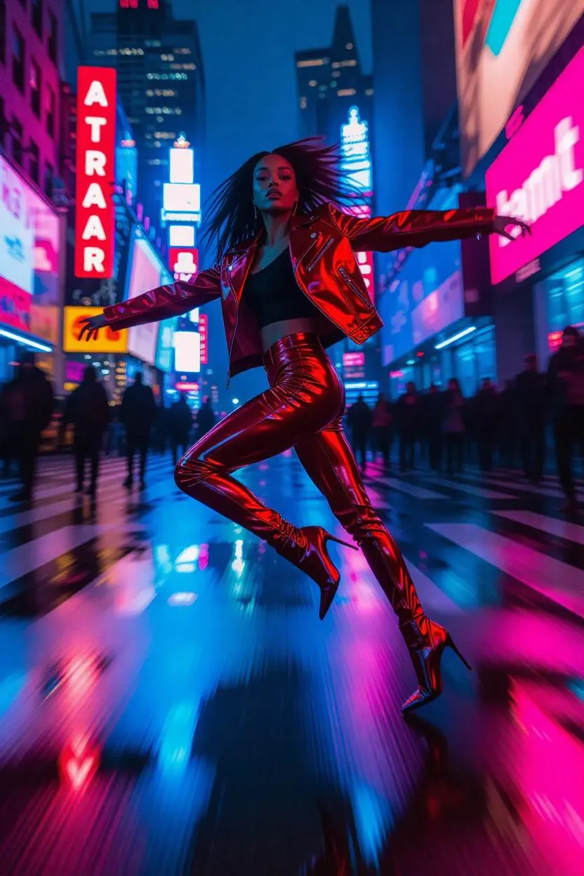 Create a dynamic AI magazine cover with a model leaping through vibrant abstract cityscapes, wearing sleek red leather jackets and metallic boots. Generate neon graffiti backgrounds, motion-blurred urban energy, and professional-grade visuals using Vivago.ai's AI image tools for striking editorial designs.