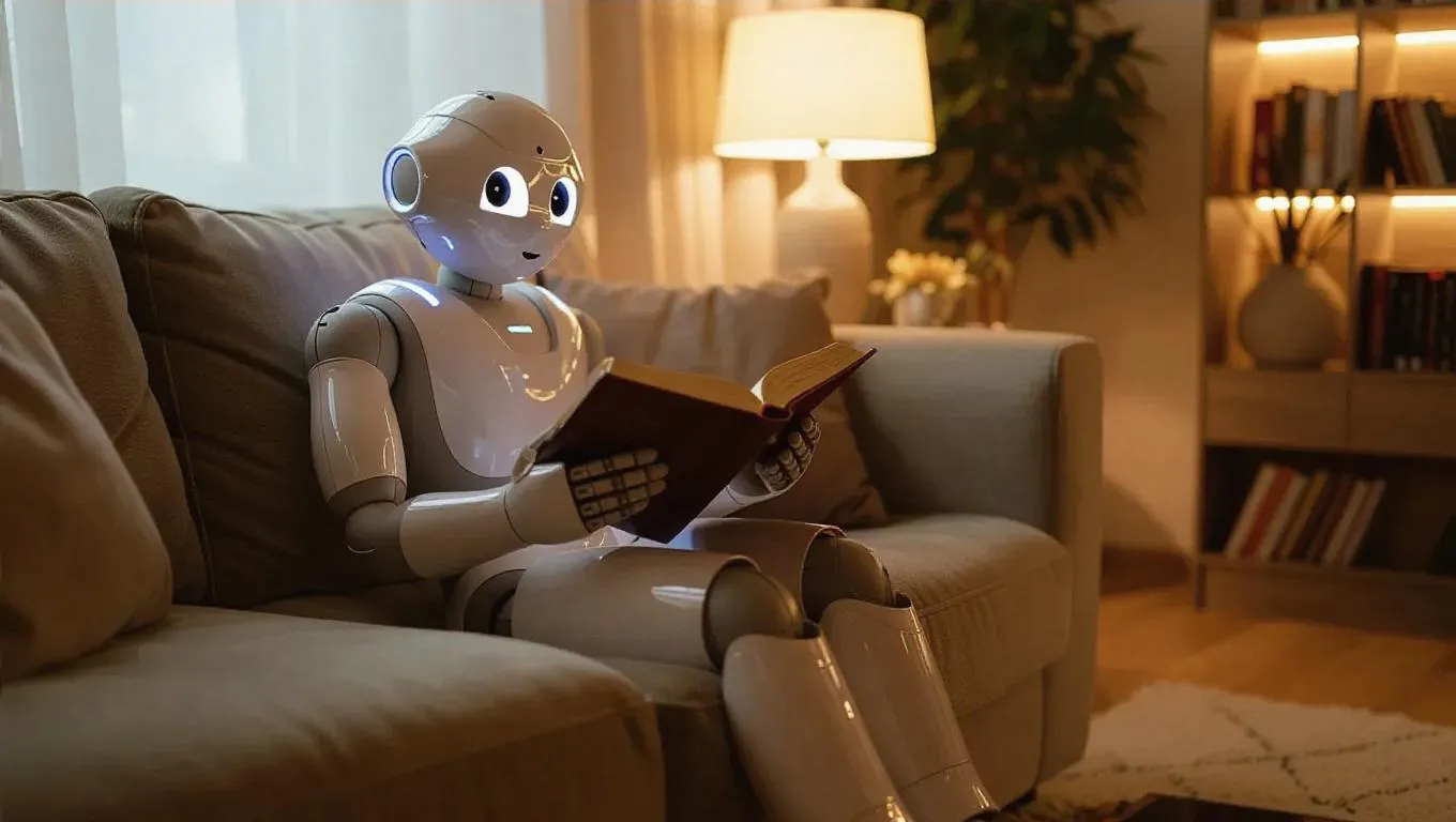 Generate lifelike AI images of an emotional robot in a living room, sitting cross-legged on a sofa, reading a Bible while learning human-like tears. Transform prompts into vivid visuals with VivaGo.ai's AI tools for creative storytelling and hyper-realistic scenes.