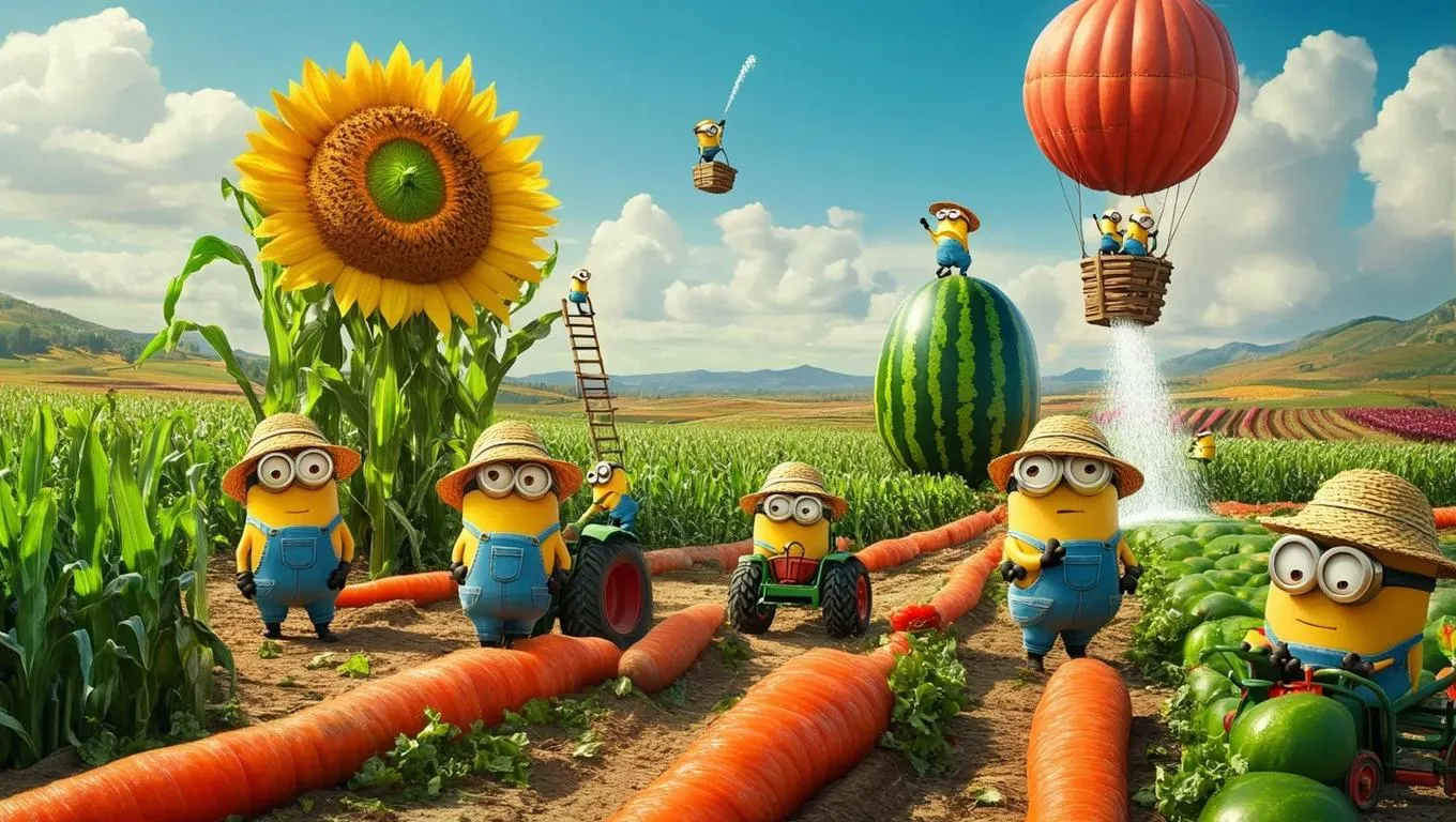 Vibrant AI-generated art of whimsical Minions farming colossal vegetables in a surreal, hyper-detailed world. Explore magical landscapes with oversized crops, playful tractors, and fantastical farming adventures bursting with color and creativity.