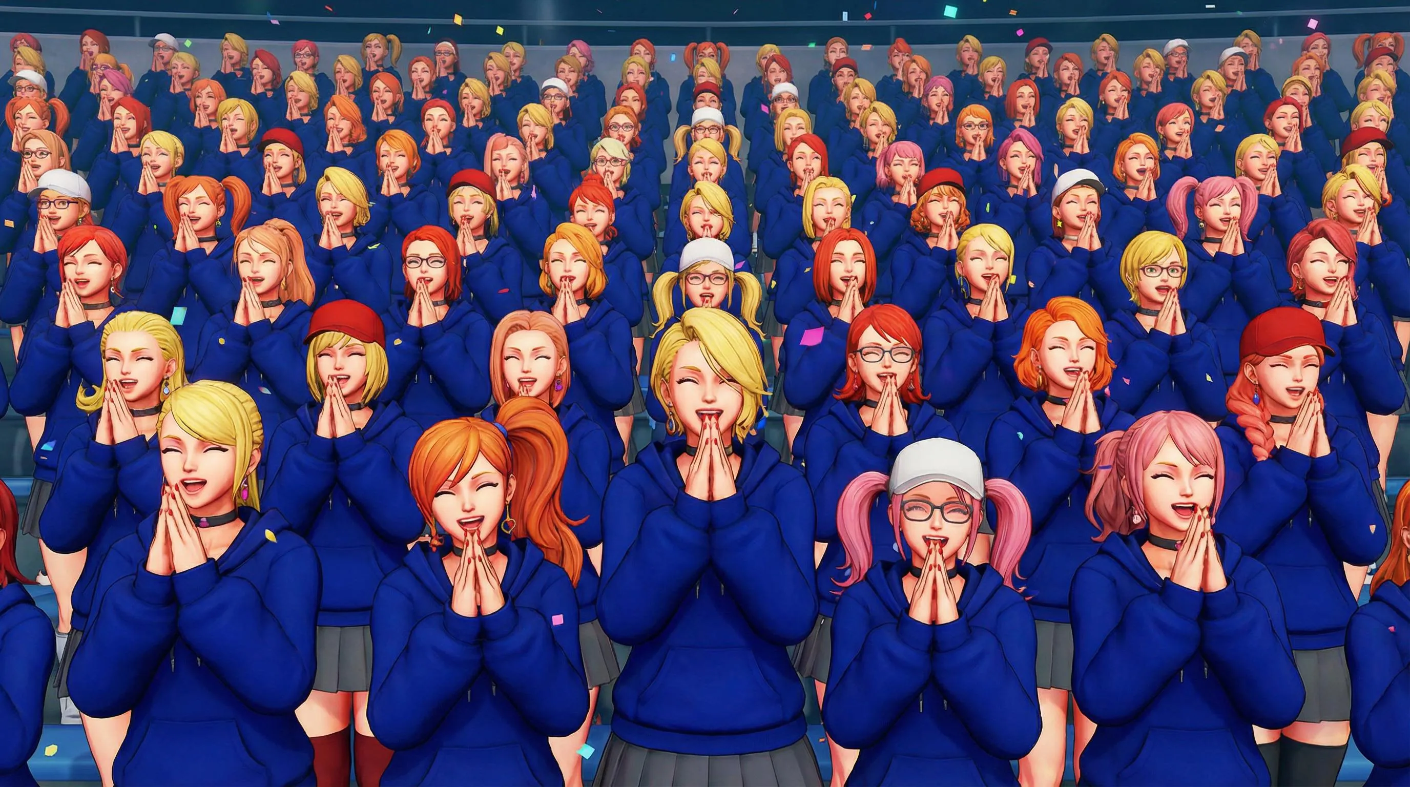 Create anime-inspired CGI crowds with Final Fantasy hairstyles in deep blue hoodies featuring moe sleeves hiding praying hands. Vibrant accessories like baseball hats, chokers, and colored nails. Generate diverse characters with elated expressions, side-swept hair, and unique sleeve styles using this AI image generator for vivid fan art scenes.