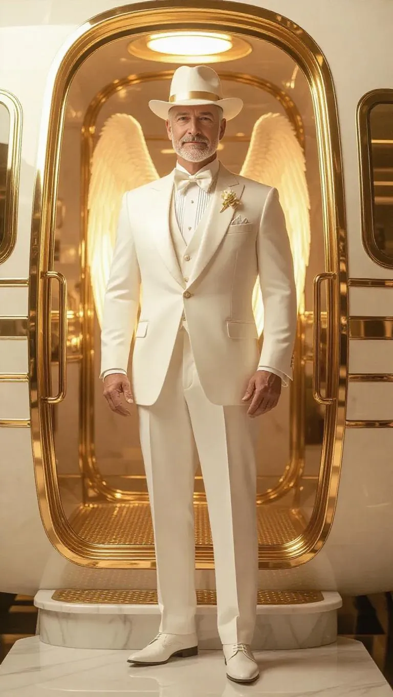 Dignified male angel in his 50s stands by a glowing celestial train in a hyper-realistic 4K cinematic scene. White-gold tuxedo, divine wings, and heavenly light create ethereal ambiance. AI-generated hyper-detailed imagery captures timeless divinity, golden sunlight, and ethereal textures for professional-grade visual storytelling. Perfect for celestial themes, divine presence, and cinematic artistry with AI-powered precision.