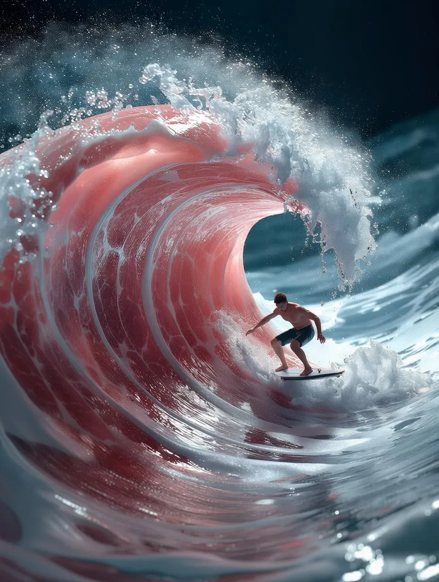 Hyperrealistic AI art transforms raw pork into a colossal ocean wave with a surfing figure. Explore surreal food photography blending cinematic lighting, razor-sharp textures, and creative scale play. Generate striking AI visuals merging tactile realism with imaginative food-world scenes for maximum visual impact.