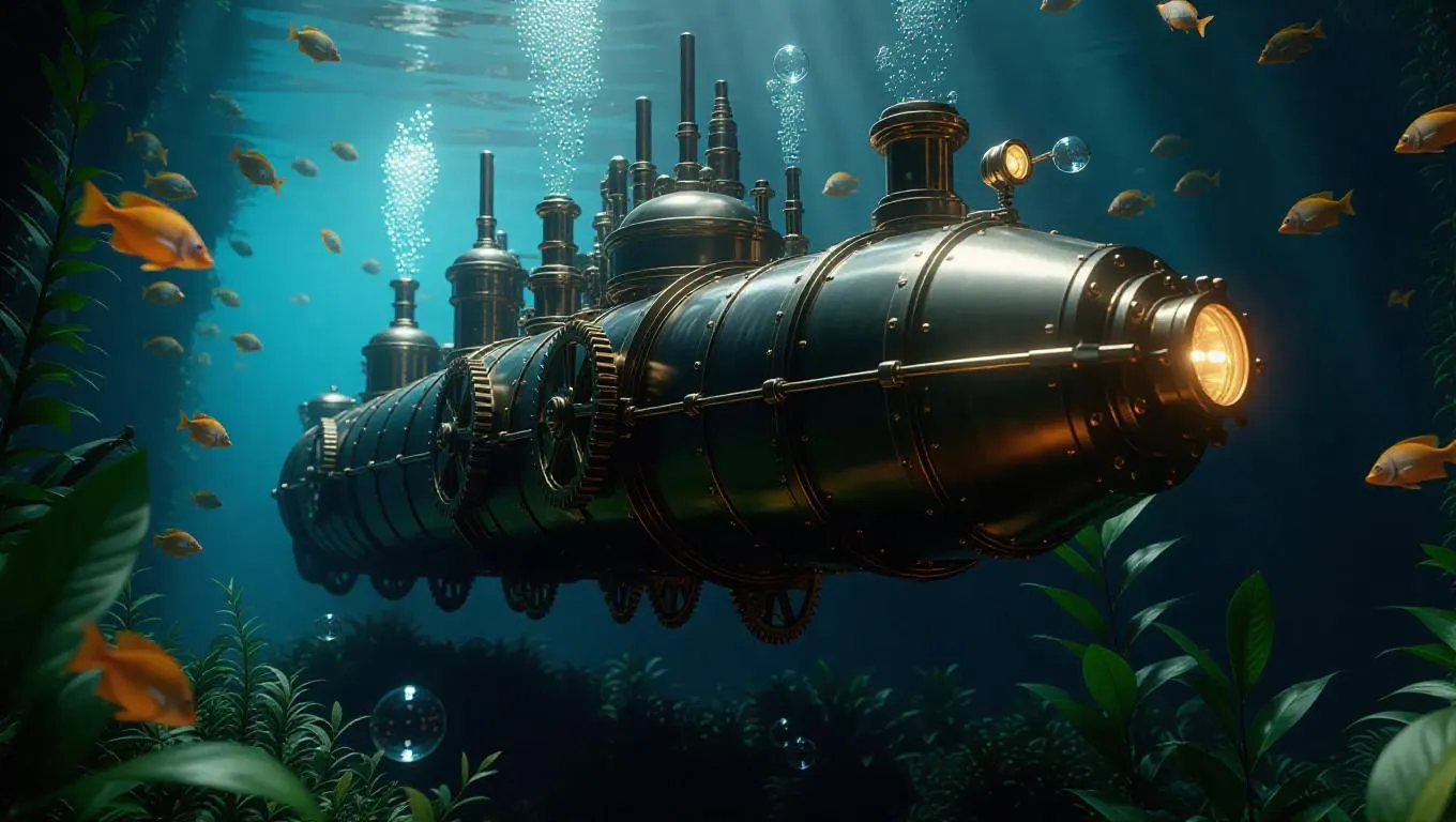 Dutch angle shot of a Victorian submarine traveling through a mystical underwater forest, brass gears rotating amidst floating plants, air bubbles rising from zinc pipes, oil-painting style with dreamy effect, enchanting underwater lighting, beautiful mechanical intricacies, diverse aquatic fauna.