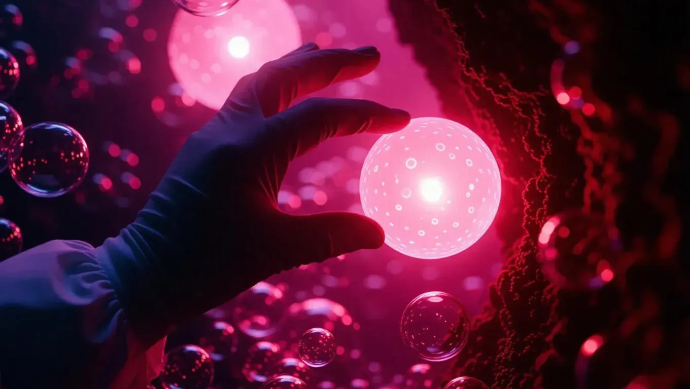 Cinematic close-up of a scientist's hand reaching toward a bright bioluminescent organism illuminating the abyss, dramatic shadows, ethereal rosy light, bubbles swirling around, underwater formations adding depth and texture