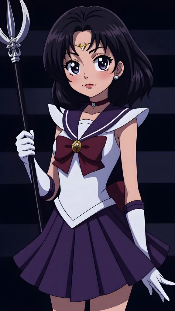 A girl stands assertively with a staff with 2 blades on top in one hand. She has dark purple hair styled in a bob and a tiara on her forehead. She is wearing a purple and whitebschool uniform like outfit that includes a skirt and a top adorned with a bow.