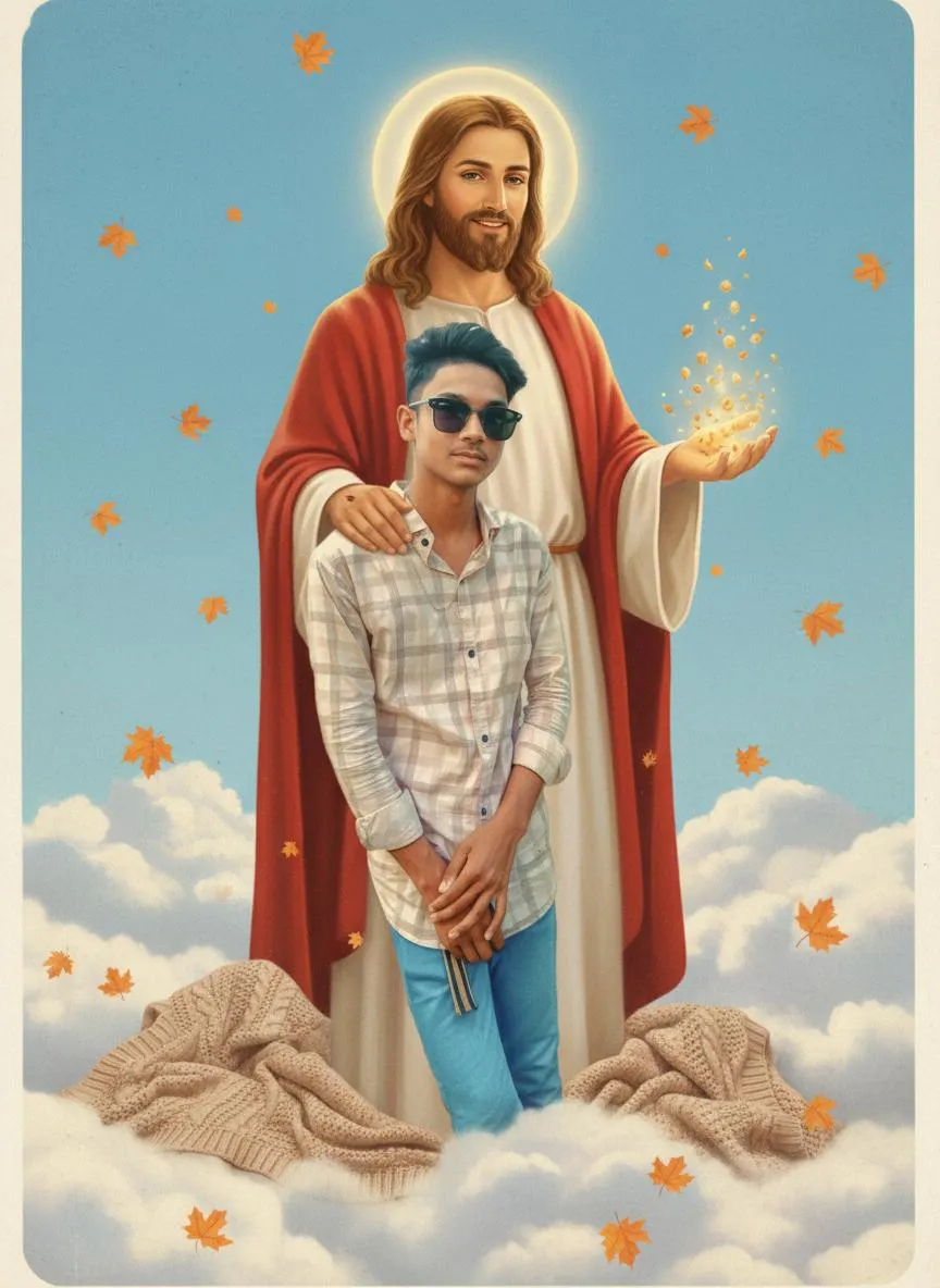 Strictly enforce facial feature lock: 100% identical to the first reference image, preserving every facial contour, skin texture, eye shape, lip shape, and youthful age with zero deviation. No artistic alteration allowed. Exact 1:1 copy of the original image, no creative interpretation or stylization permitted. A young East Asian woman with a cold, ethereal demeanor sits on damp bluestone paving, body angled 30° to the left, left arm folded across her torso, right hand gently gripping a large pale blue-white gradient flower, right elbow resting on her left forearm, left hand resting lightly on her right knee. She gazes at the camera with a detached, slightly lazy expression, lips pale pink and slightly parted. Her medium-length hair, a soft mix of dark brown and black, is adorned with large, ruffled light blue-purple gradient flower accessories on the right side, with a few strands of hair gently blowing in the breeze. She wears:A multi-layered Miao silver collar with delicate dangling silver beads. A wide, intricately carved silver bracelet on her right wrist. A slim silver bracelet on her left wrist. A strapless top with a crisp white base and bold dark blue swirling cloud motifs. A floor-length pleated skirt in a sharp black, white, and royal blue geometric pattern, with horizontal stripes and wave details on the hem Background is an exact replica of the original Dong-style wooden covered bridge: dark grey tiled roof, polished wooden pillars, distant lush green trees, and hazy mountain peaks under a soft, overcast sky. Precise lighting & tone lock (1:1 match to original):Soft, diffused morning backlight with a gentle, airy halo that wraps around the subject’s hair and shoulders, creating a subtle glow on the damp bluestone ground. The exact color palette of the original image is strictly preserved: cool, low-saturation tones dominated by crisp white, deep navy blue, and matte black, with a soft focus filter that gives the image a delicate, dreamlike cinematic quality. No over-saturation, color shifts, or harsh shadows are allowed. All elements must match the original image pixel-for-pixel; no creative additions or changes permitted.