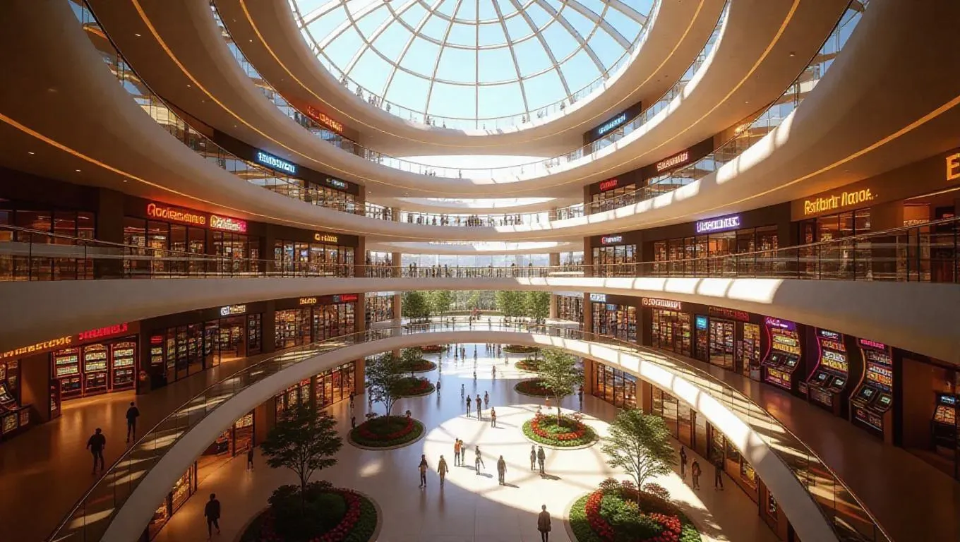 Experience vivago.ai's AI-generated futuristic amusement park: a breathtaking 50-story vertical wonder with multi-tiered thrill rides lining a central atrium. Soar past interactive exhibits under a massive glass-domed ceiling. Sleek balconies offer panoramic views of vibrant arcades and attractions, all bathed in natural light. Create your own immersive entertainment complex with AI-powered creativity.