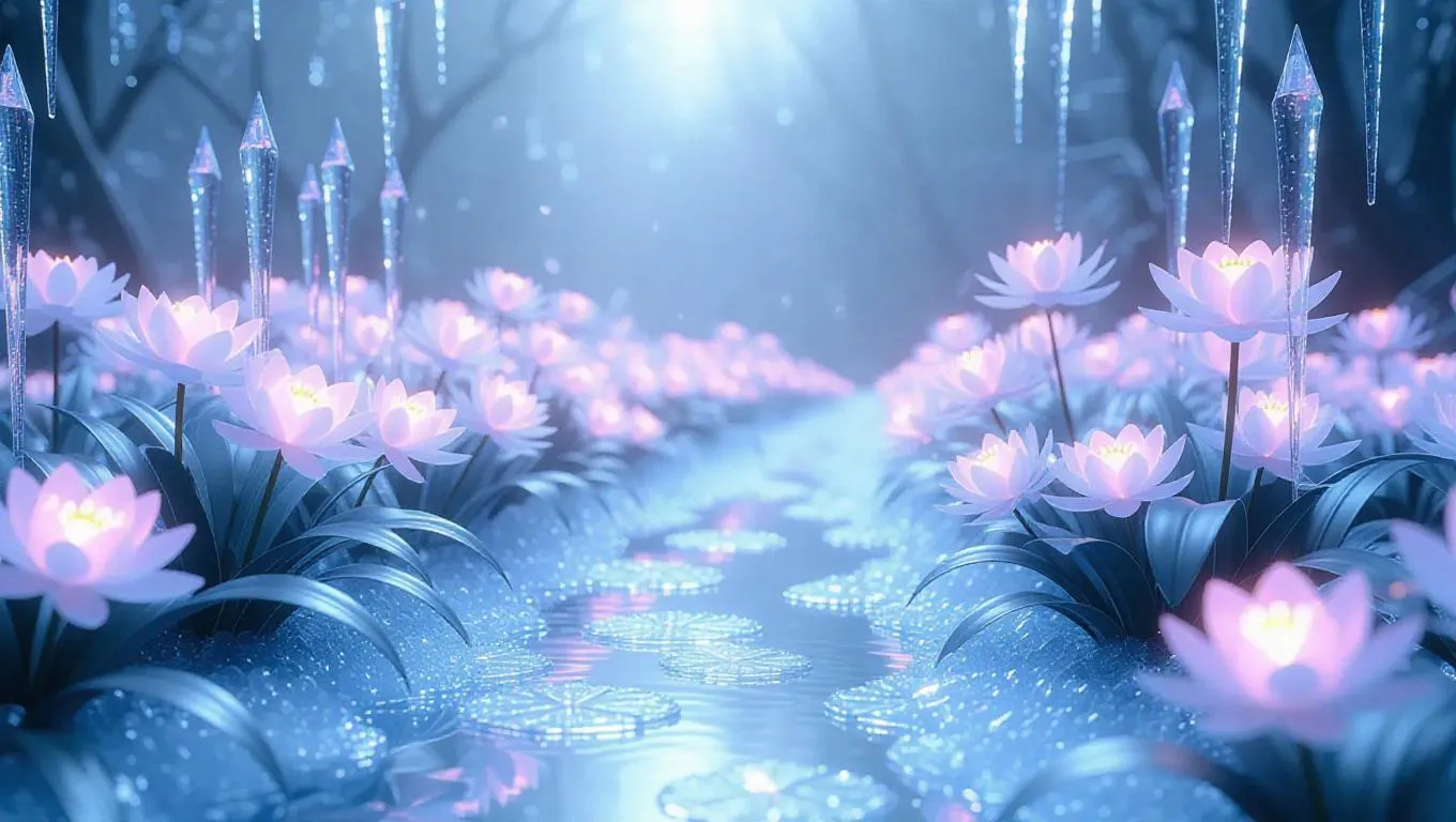 Text to ImageA mystical path adorned with glowing ice lilies blooming alongside glistening icicles, petals crafted from translucent frosted crystal, casting ethereal light and shimmering hues, creating an enchanting winter wonderlandRecreate