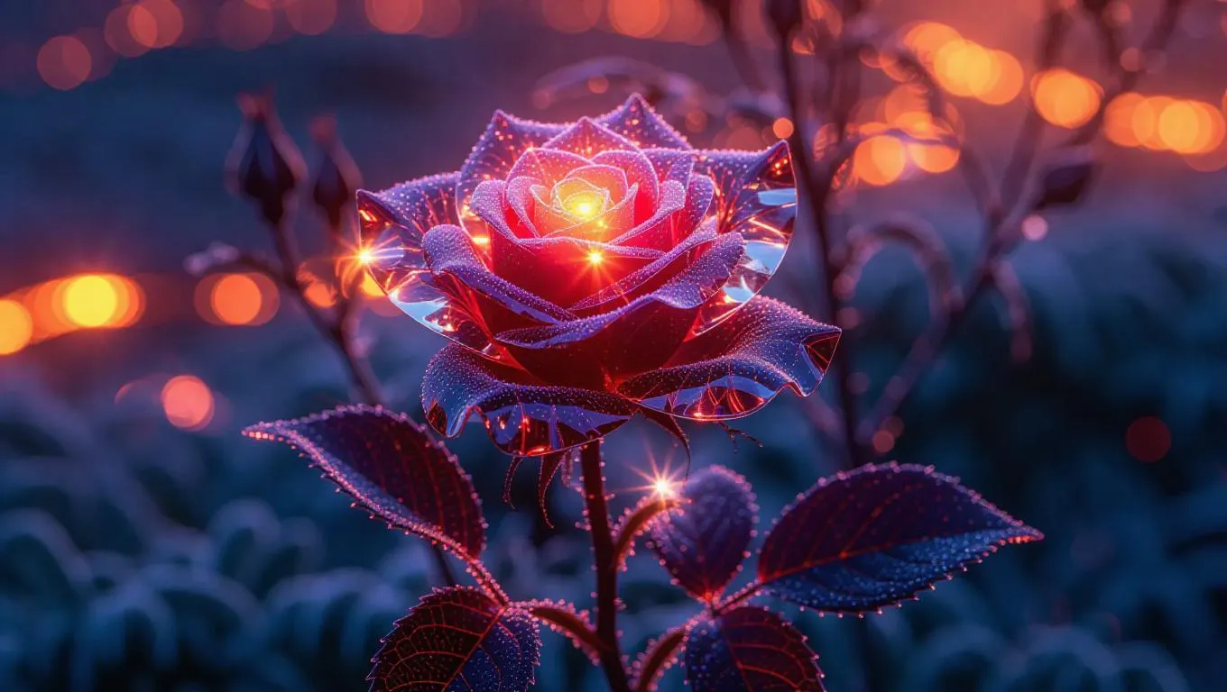 A frozen rose bush, each bloom crafted from glassy crystal, sparkling brilliantly in the sunlight, surrounded by a frosty mist that adds an ethereal glow, set against a backdrop of glowing lava and a dramatic sky
