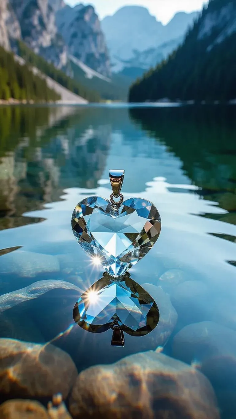 A heart-shaped crystal pendant, resting delicately on a clear lake’s surface, glowing faintly with an ethereal inner light, casting soft, shimmering reflections on the tranquil water, surrounded by a serene, mountain landscape