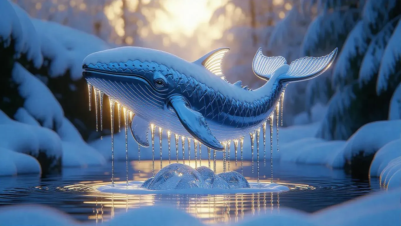 A majestic frozen fountain shaped like a whale, water suspended mid-motion in large crystal cascades, surrounded by a blanket of snow, with soft, gold light creating a magical ambiance, emphasizing the intricate ice formations against a backdrop of a serene frosty ravine.