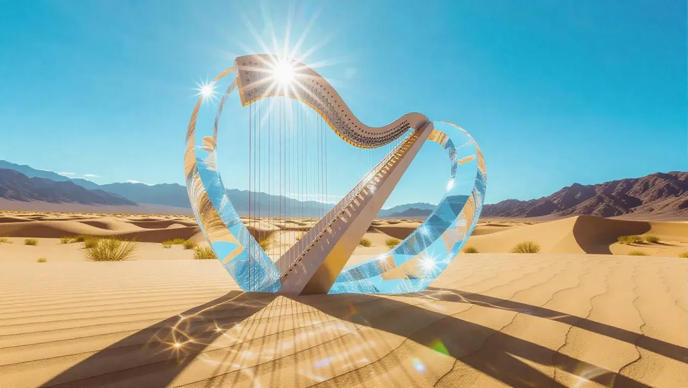 Text to ImageA mystical ice crystal harp arching gracefully over a desolate desert, shimmering under the scorching sun, with ethereal sand patterns shifting in the wind, creating a spellbinding arid oasis.Recreate