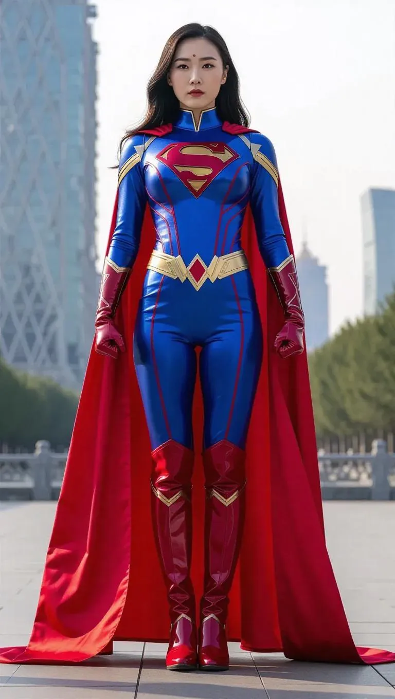 Create dynamic AI-generated visuals of a Chinese superheroine rescuing Beijing in 8K HDR. Features a 25-year-old heroine in red/blue kryptonite-fiber tights, hammer-and-sickle chest emblem, flowing cape, and glossy over-the-knee boots. Full-body 360-degree view highlights stance (legs shoulder-width apart) and vibrant details. Perfect for AI art enthusiasts seeking high-quality superhero scenes with professional editing tools.