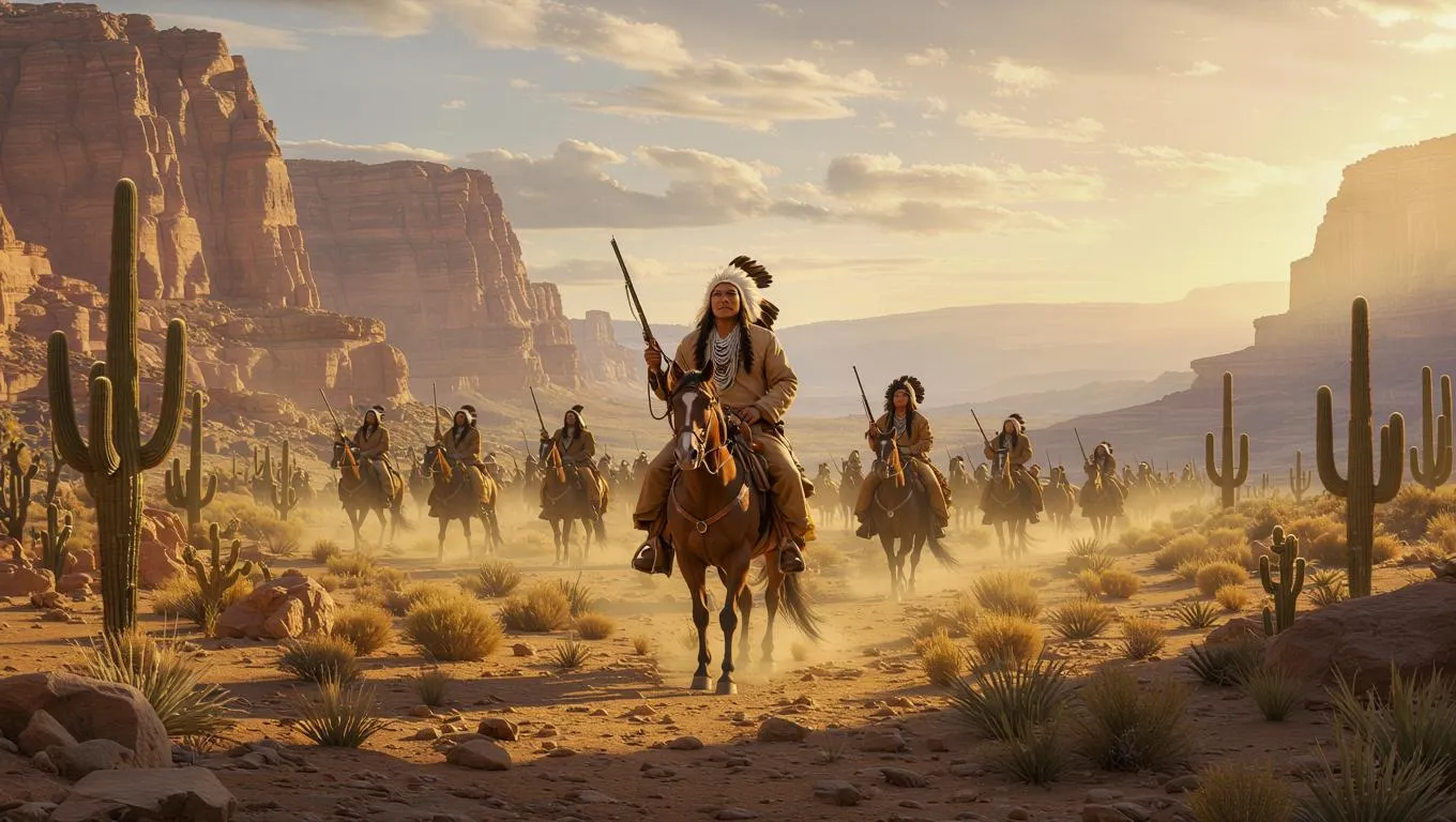 Create AI art visualizing Geronimo & Apache warriors on horseback! Generate an epic desert scene: legendary Apache leader with rifle, armed warriors behind him, tall cacti, and canyon backdrop. Epic historical Arizona landscape prompt for powerful image generation.