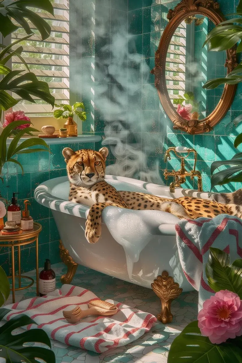 Whimsical cheetah lounges in a vintage bathtub amid lush jungle foliage, iridescent suds, and boho textures. AI-generated surreal art blends tropical luxury with playful dreamscapes—vivid blooms, teal tiles, golden eyes, and sunlit shadows. Explore bold, imaginative visuals powered by Vivago.ai's creative tools for striking, colorful, and ethereal AI image generation.