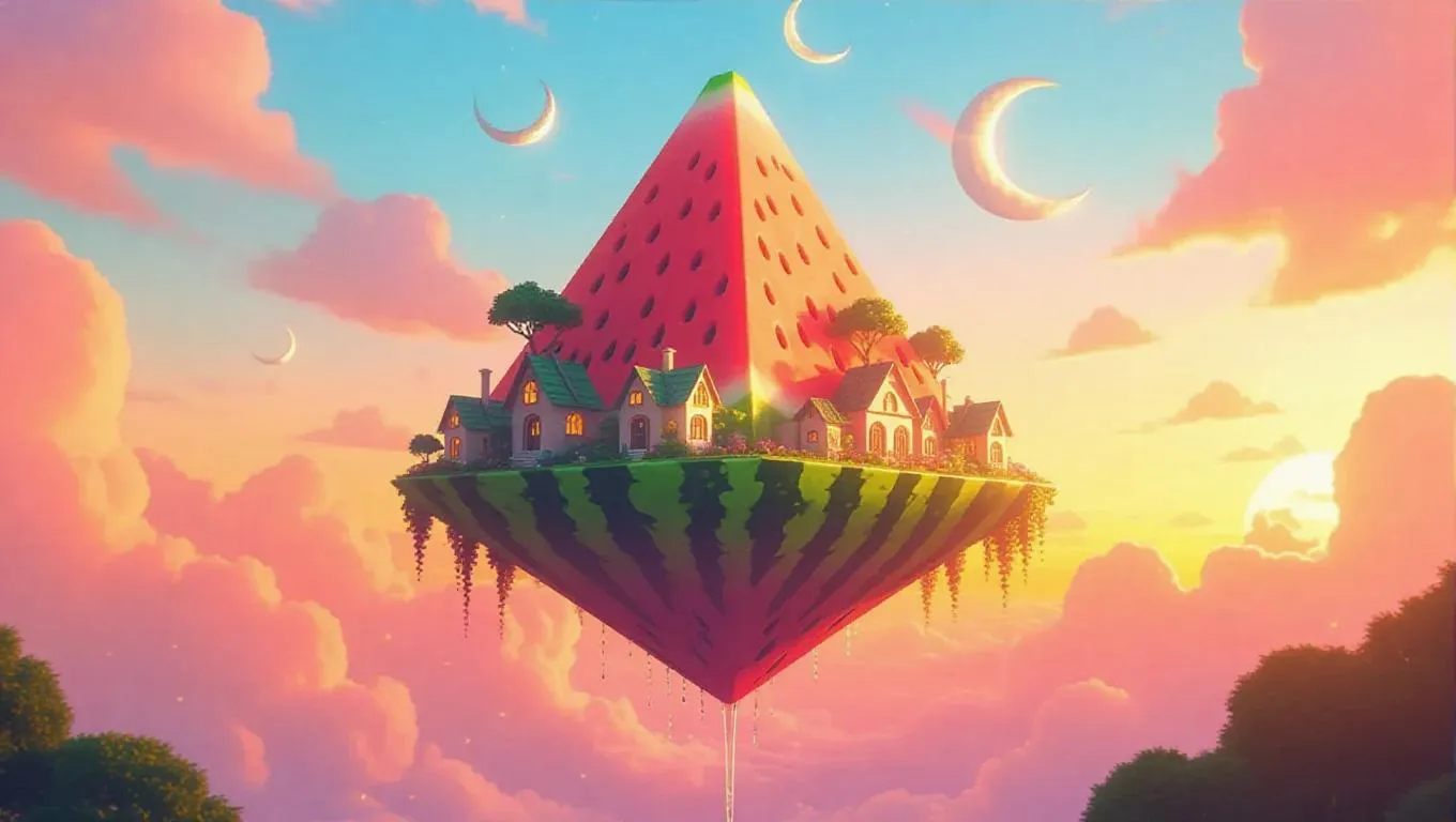 A whimsical floating pyramid shaped like a giant watermelon, adorned with tiny moon-shaped houses and rivers flowing with sparkling nectar, suspended under a vibrant sunset sky, with swirling clouds and a warm breeze.