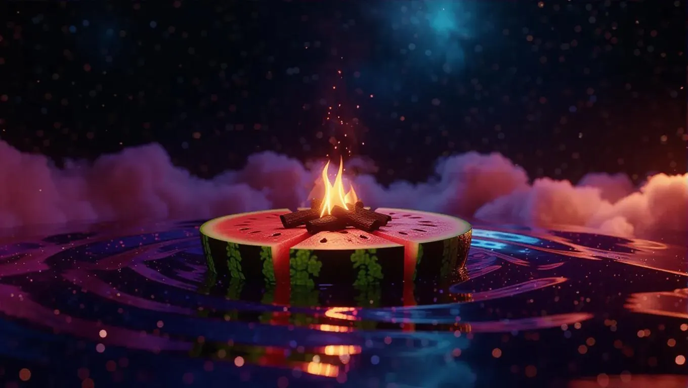 A whimsical watermelon island floating in a cosmic sea of sparkling diamonds, topped with a cozy campfire casting a warm, inviting glow, surrounded by a gentle aura of stardust and celestial light