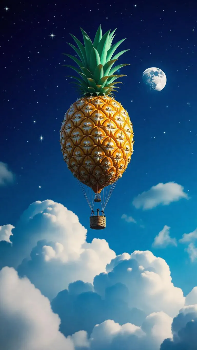 A whimsical pineapple-shaped blimp floating through deep blue skies dotted with twinkling stars, carrying adventurous spirits. The blimp's vibrant hue contrasts with the soft, fluffy clouds, creating a surreal and enchanting atmosphere. Moonlight filters through, casting a shimmering, silver glow that enhances the magical journey.